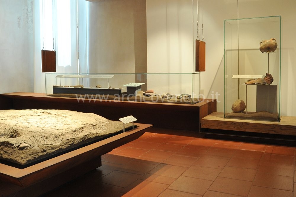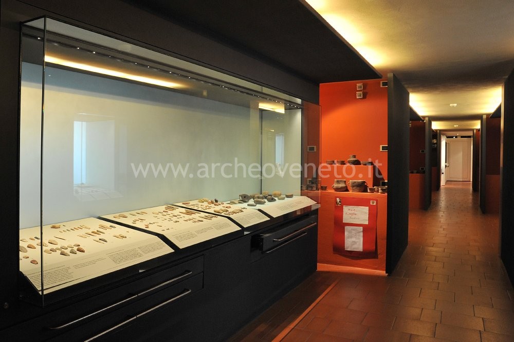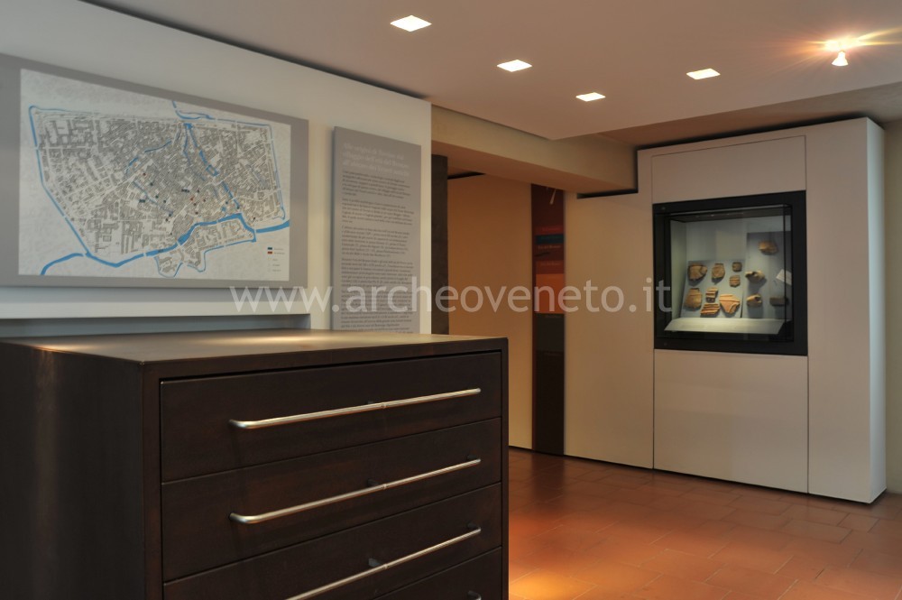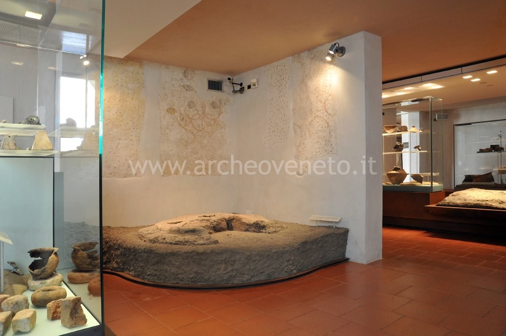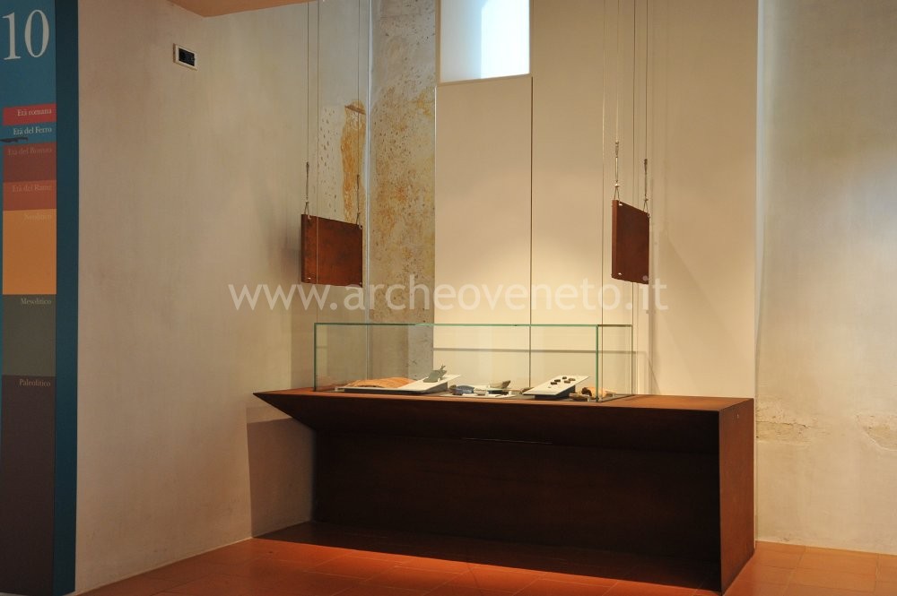Room no. 9 introduces the passage from the late Bronze age settlement to the village of ancient Veneti people which developed during the early Iron age (from 10th-9th to 8th-5th century BC). The room contains other findings from the area of Piazza San Pio X. In this urban area, a vast quarter of the village was brought to light, composed of houses with a rectangular plan, wooden roof, fireplaces and typical circular braziers made of loam and clay, accurately placed in the corners of the room. The display cases contain pottery (some of which for domestic worship), knitting and weaving tools and objects related to fireplaces; on the left side of the entrance the cast of an oak table originally used as the base of a fireplace is exhibited.