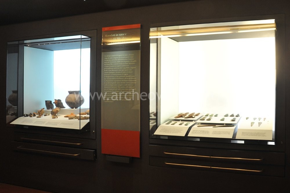 The second display case on the right and the larger one on the left exhibits, in a chronological order, a prestigious collection of weapons (axes, daggers, spearheads), tools (sickles) and items of clothing. These metallic artefacts were found in the clay and gravel pits situated between Sant’Antonio and Casier and date back to the Copper and Bronze Age. Presumably they were related to funeral or votive rites.