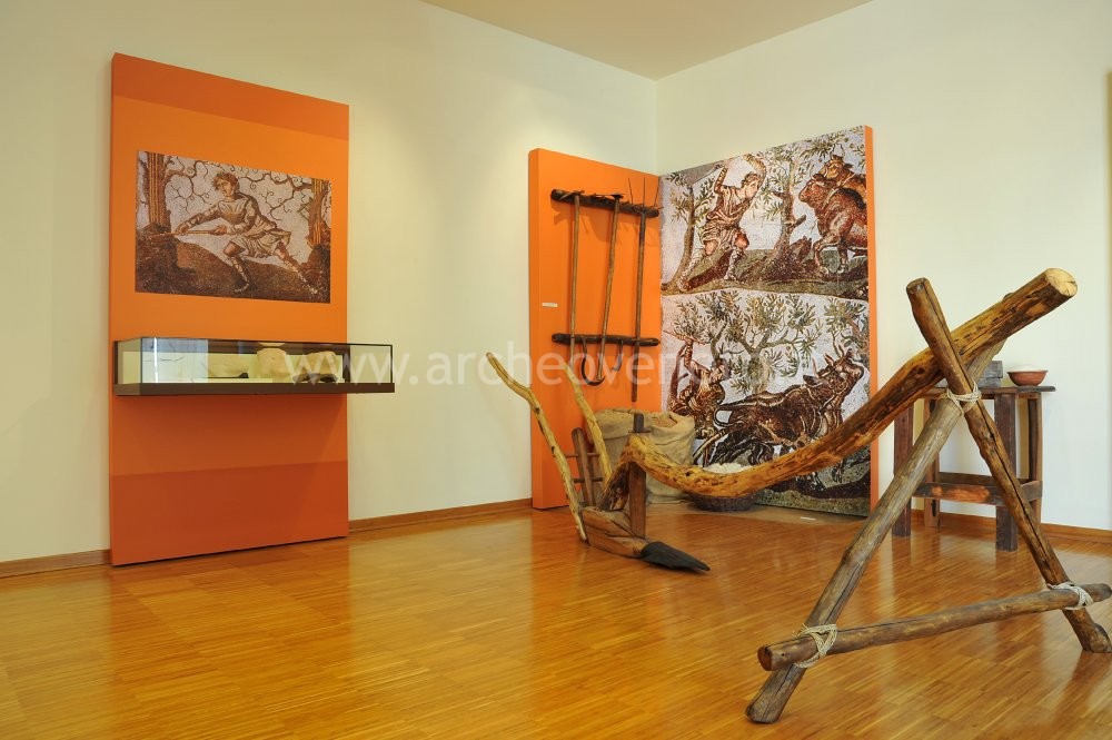 The second room addresses the activities linked to the centuriation (field system). The path goes on from the left side of the room, where it is possible to see some panels providing information on: division and distribution of the land (explaining how the land was divided within each centuria), the boundary worship (showing that the protection of the land and its boundaries relied not only on human laws but also on the divine intervention), farming and stock breeding. The last two panels are supported by the reproduction of a wooden plough, some tools linked to the farming world (hoe, pitchfork, sickle and bill hook) and some products used by the rural communities (sacks with spelt and baskets with wool), which can be seen in the centre of the room. The only two original finds displayed in this room are some fragments of dolia and numerous iron blades of farming tools.