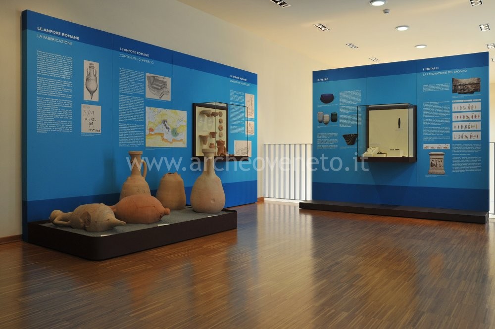 The following panel addresses the topic of amphoras, from their manufacturing to the explanation of their commercial function and the different ways in which they were used. Below and next to the panel, it is possible to see some whole wine and oil amphoras (mid 1st cent. B.C. – mid 1st cent. A.D.) as well as rim fragments, tips, handles and tops of amphoras coming from the Alta Padovana (northern area of the province of Padua).