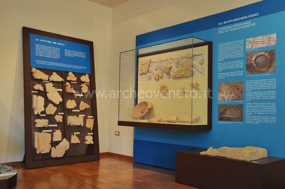 The central part of the room displays the archaeological finds discovered during the excavation of the handicraft workshop in the former Fondo Mometto (1st cent. A.D.), which consist of fragments of earthen architectural elements (engraved terracotta plaques and antefixes), fragments of stamped tiles, a large ceramic mortar with a hole and a terracotta bowl.