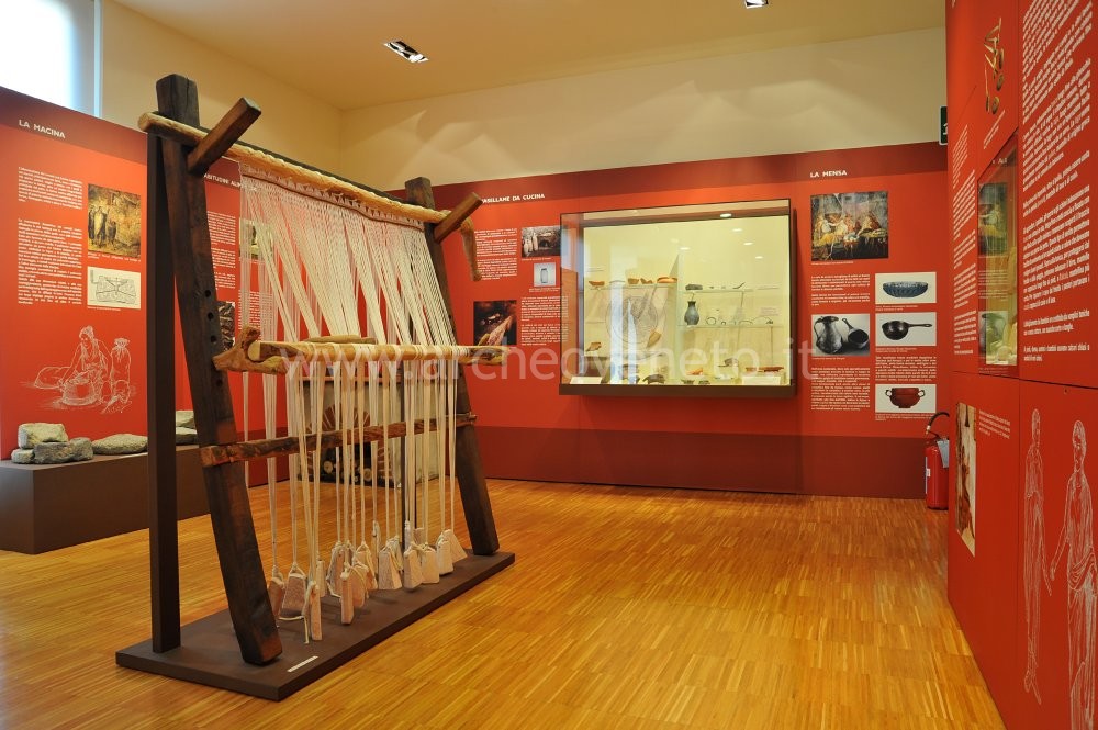 Another important activity was weaving, as proven by the reproduction of a large wooden vertical loom at the centre of the room and a display case containing loom weights, reels and spindle whorls of the 1st cent. B.C. The issue of weaving is closely linked to the topics of clothing (described though graphic reconstructions and the display cases containing bronze fibulae and glass buttons that can be traced back to a time span between the 1st cent. B.C. and the 3rd cent. A.D.) and of cosmetics (explained through the exhibition of glass unguentaria, a bronze strigil, glass beads, a ring and a pair of tweezers, all dating back to the early Imperial Age).