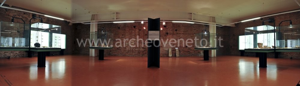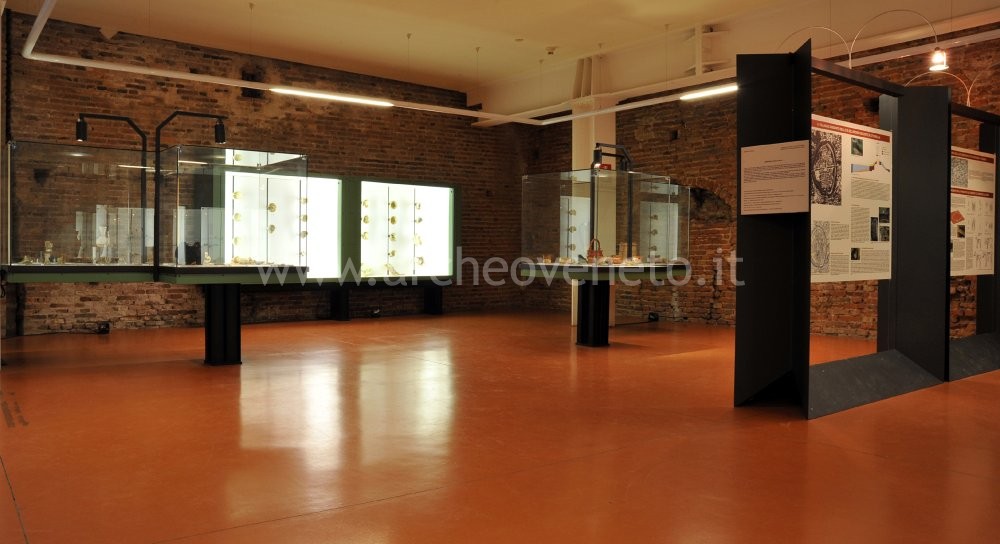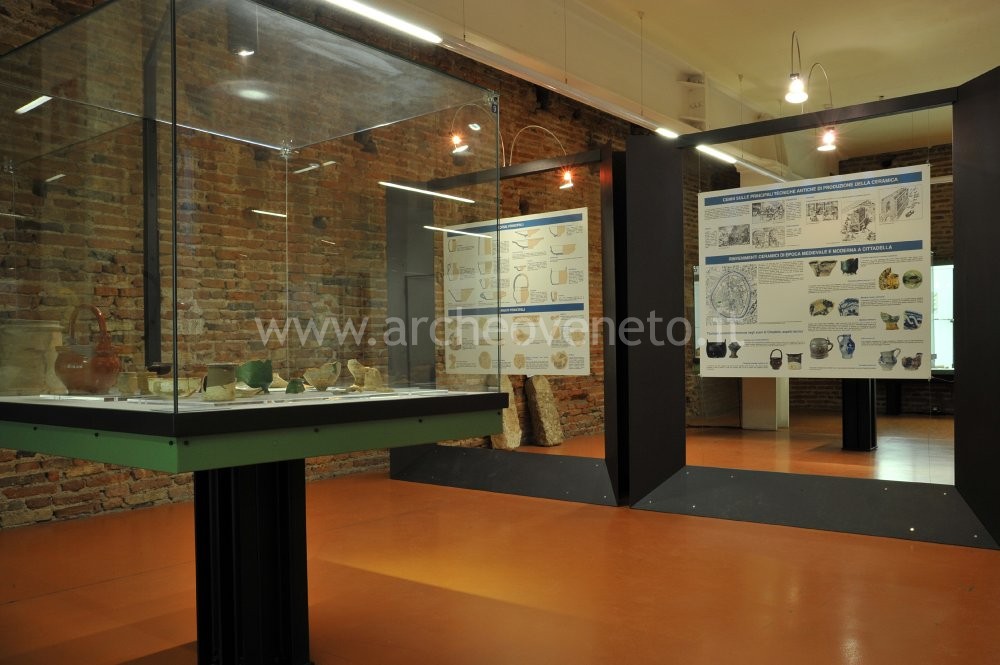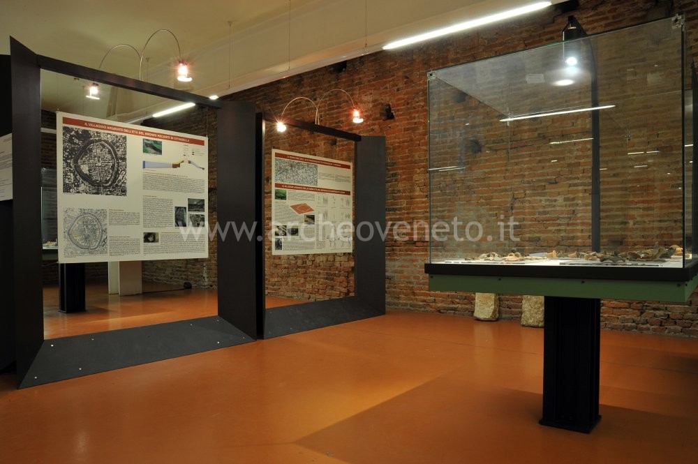 The visit to the exhibition starts with large information panels placed in the middle of the room, which virtually divide the space into three chronological sections, referring to the main stages in the history of the area around Cittadella: prehistory on the right, roman Age in the middle and Middle Ages/modern history on the left. The panels turned towards the right present the studies carried out in the banked village of the recent Bronze age located in Cittadella as well as the one of the Late Bronze Age in S. Martino di Lupari. Both are examples of banked city walls for the defence of the village.