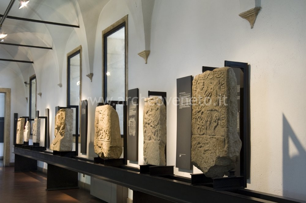 Thirteen rectangular slabs in trachyte or limestone, dating back to a time-span between the 6th and the 1st cent. B.C., belong to the first group; usually they figure a scene of departure, in which the dead is often represented on a horse or chariot; there is also a "speaking inscription" in which the venetic term "ekupetaris" ("lord of the horse" or "horseman") is recurrent. Among the most important there are the stele from Camin (6th cent. B.C.) and the Ostiala Gallenia one (1st cent. B.C.).