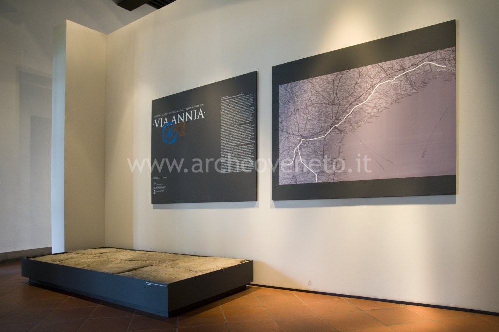 It is the room which introduces the permanent exhibition about the Via Annia. In this ante-room it is explained, through four large panels, how this route assumed a particular importance as an evidence of the process of "romanization" which involved the Venetic area between the 2nd and the 1st cent. B.C. A map displays the hypothetical ancient route of the road, which must have started from a southern centre and, crossing Padua, Altino and Concordia, ended in Aquileia. Nearby these panels it is displayed part of a paved road discovered in 1972 in via Altinate.