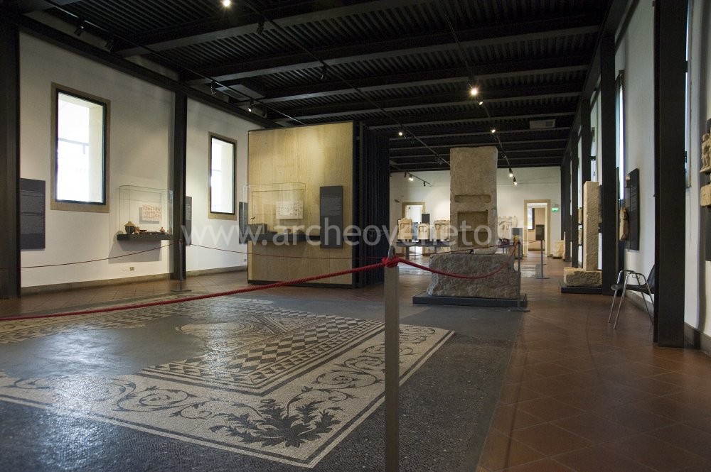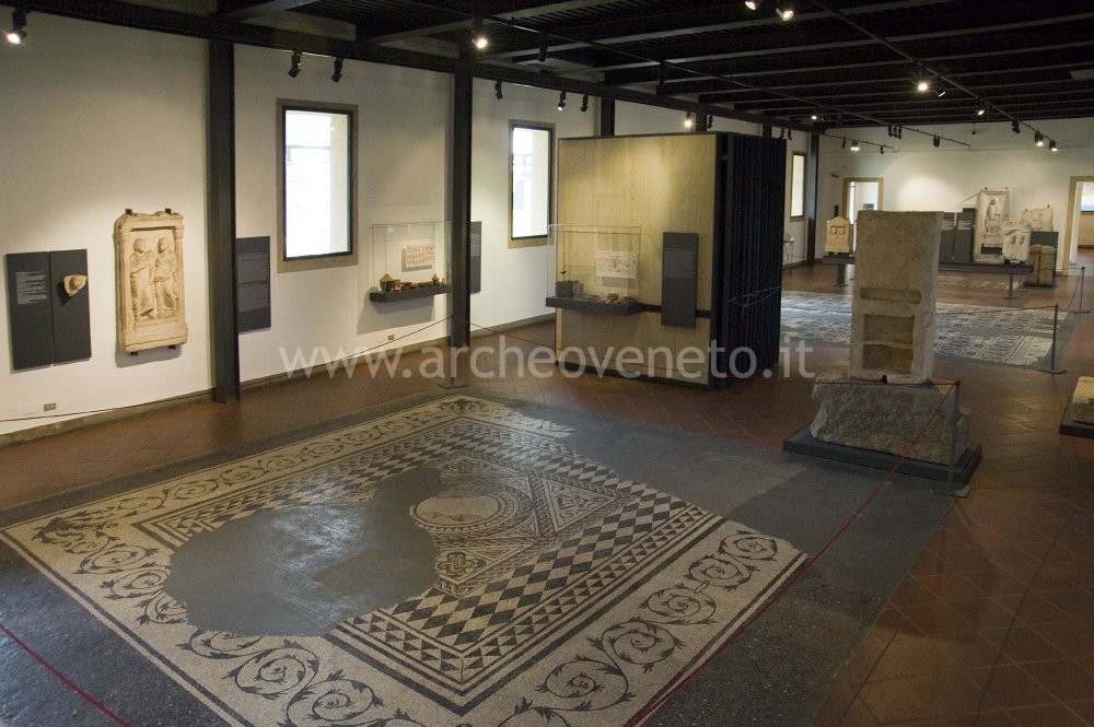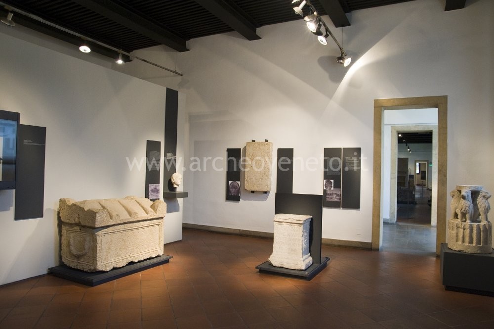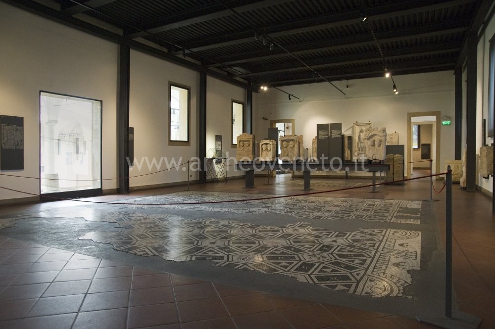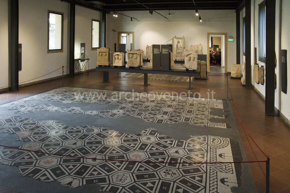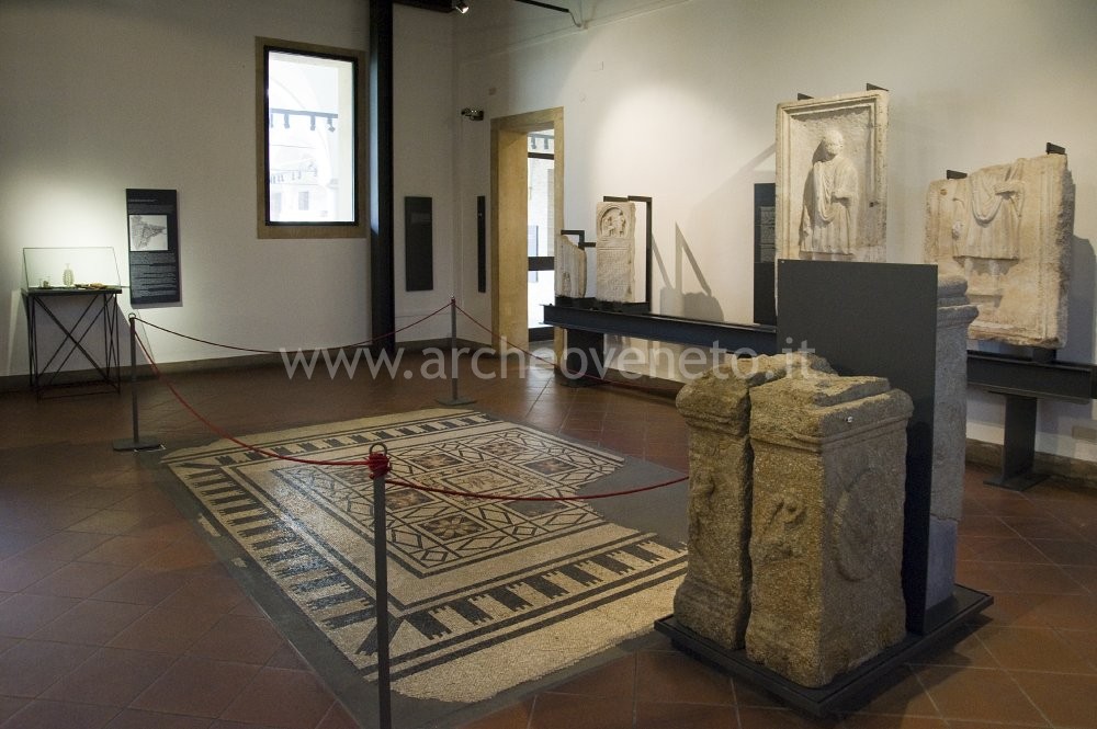 The three mosaics, arranged on the floor, come from the excavations of Palazzo degli Anziani (a heated bath room), of via C. Battisti and via S. Lucia and date back between the 1st and the 2nd cent. A.D. Mosaics from Padua are almost always without human figures and animals, while geometric and stylized vegetable motifs are widespread. Among the funerary stone items collected in this room there are funerary carved slabs, sarcophagi and altars. Funerary slabs with portrays are arranged along the northern and southern walls of the room. Among the southern ones the Stele degli Oppi, coming from Bassani's collection and dating back to the1st cent. A.D., is particularly noteworthy. The trachyte gravestone has a box-made nyche in which the four deads recalled by the lower inscription are represented. The Stele di Maxsuma, of uncertain origin (maybe Noventa Vicentina) and dating back to the early imperial age, is particular because the dead woman is represented in half-lenght bust into a nyche bearing an apple, probably connected Dionysiac rites and cults. Among the northern funerary slabs, it is noteworthy the one dedicated to the horse Aegyptus, wich recalls the important role played by this animal even in the Roman world.