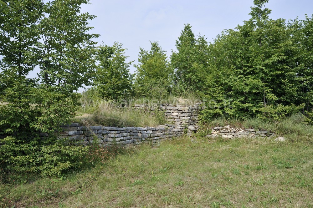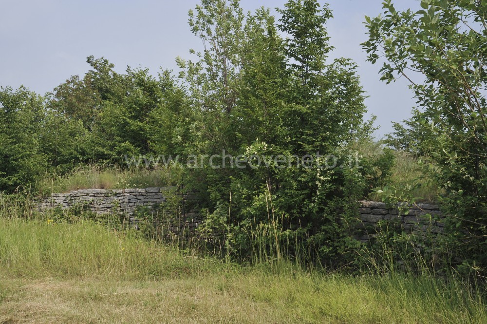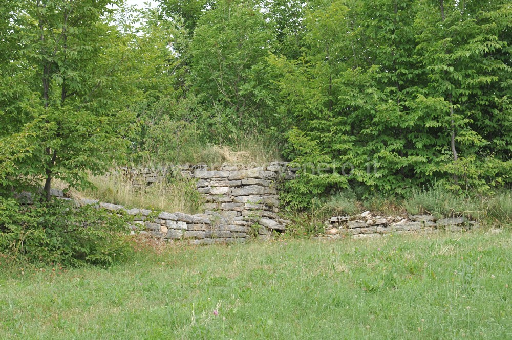 The settlement “Le Guaite” at “Sant’Anna di Alfaedo” is constituted by a set of dry stone walls that represent the southern and most defended part of a prehistoric hill settlement of middle and late Bronze age (1700 – 1200 B.C.). The wall has a wedged shape and it is made with a load-bearing technique, that means through the construction of two parallel dry-stone walls filled in with small stones and soil. The wall is over 3 metres thick and suggests its defensive function. No trace is remaining of the rectangular huts that were found during the excavations. At present time the vegetation has covered great part of the ancient structures, which nevertheless are still visible.