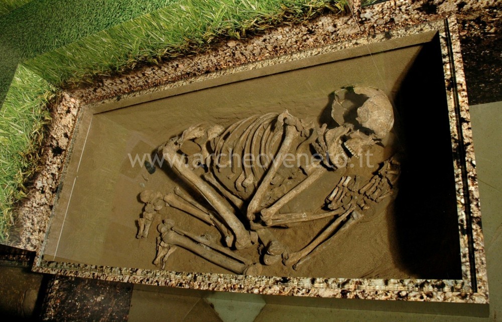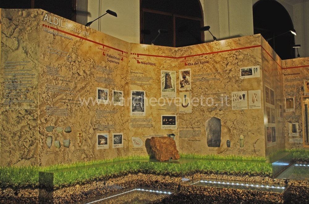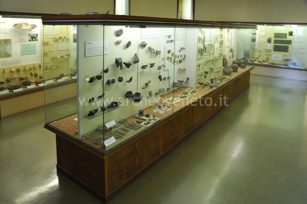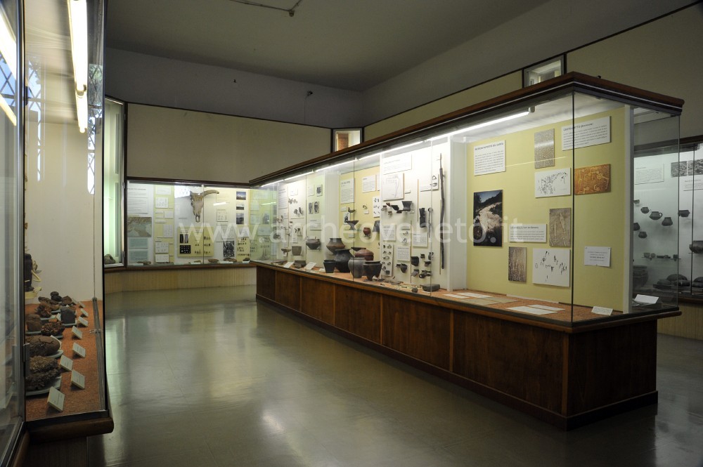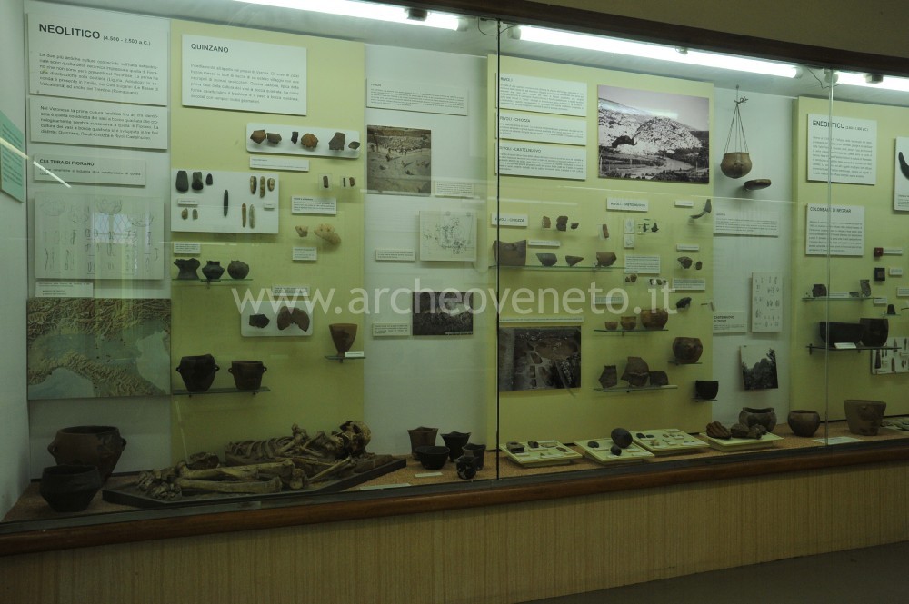 The third display case contains finds dating back to the Upper Paleolithic (36,000-10,000 years ago) discovered in the sites of Torbiera di Barbarago (skull of an aurochs - bos primigenius-), Grotta di Fumane (pictures of worked shells and bones), Riparo Tagliente (examples of recent Epigravettian lithic industry, fragment of mandible and a shell necklace). The visit goes on with the exhibition of Neolithic traces found in the area surrounding Verona, in particular in Quinzano (square mouth cups and vases, green stone hatchets, scrapers, idols and pintaderas, fragments of figuline pottery, a tulipan-shaped cup and the grave of a body in a huddled position), which is a settlement typical of the Square Mouth Vase Culture (5th millennium B.C.); the other items come from Rivoli Chiazza (pottery decorated with characteristic patterns); Rivoli Castelnuovo (square mouth vases with herringbone decoration, a refined stylized statuette of Venus, pottery in the “Aichbul” – style).
