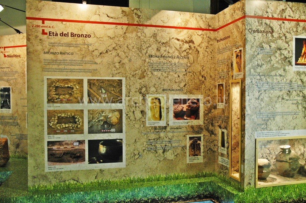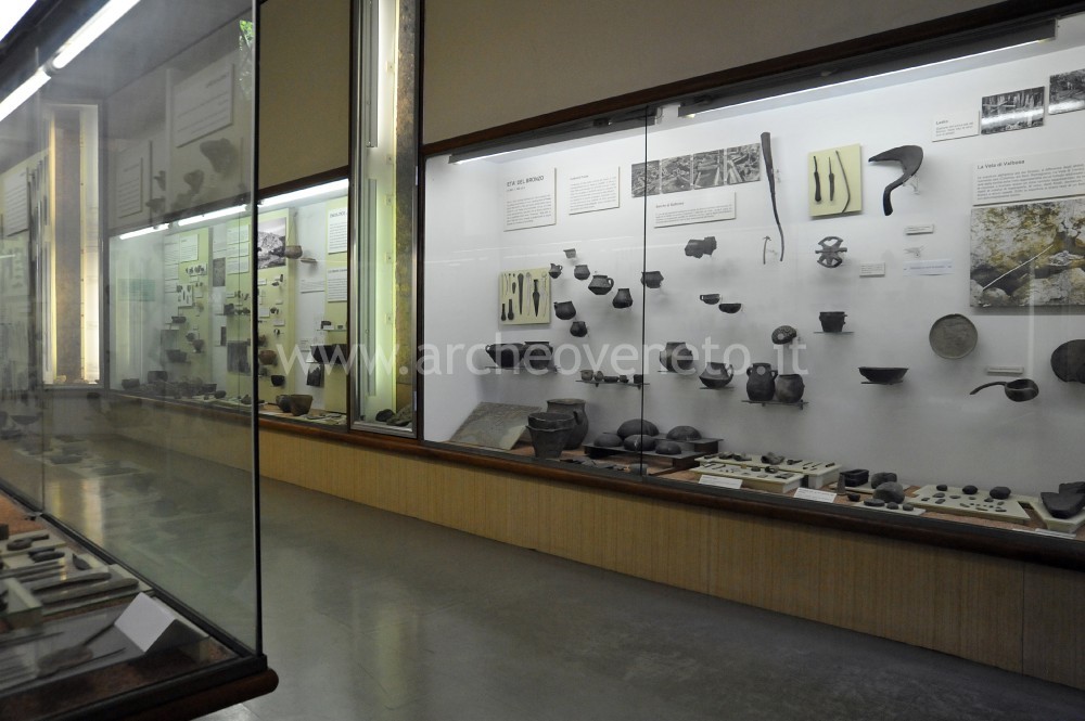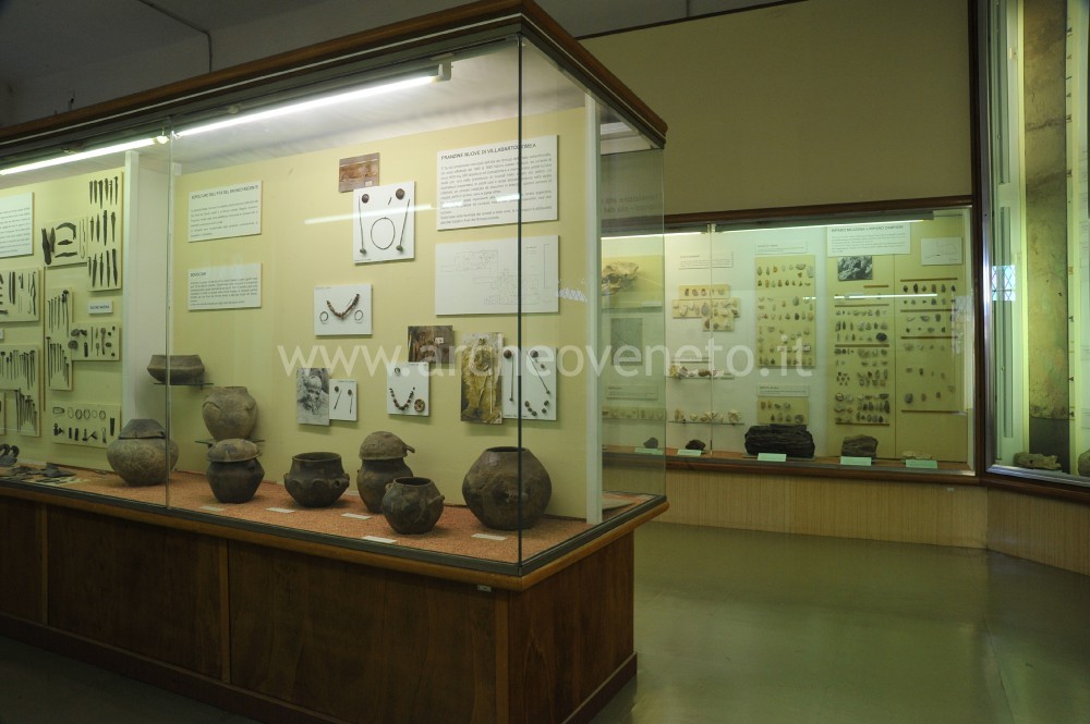 The fifth display case contains a set of finds dating back to the Bronze Age, which are particularly interesting. They come from Barche di Solferino (numerous examples of pottery of unpurified clay that is typical of the Polada culture, flanged axes, pins, bronze daggers, the cast of a wooden spoked wheel and a sickle with wooden handle and flint blades), Bor di Pacengo (pottery and bronze artefacts) and Porto di Pacengo (greenstone axe with handle in deer antler). Also the sixth display case contains objects dating back to the Bronze Age, which were discovered in Cisano (numerous ceramic fragments, bronze items and decorated bone objects), Tombola di Cerea (numerous ceramic materials and few examples of metal artefacts), Fabbrica dei Soci (ceramic material), Venezia Nuova (pottery), Castello del Tartaro (ceramic material with influences from the Adriatic region), Peschiera (extraordinary amount of bronze objects, including fibulae, pins and blades of different kind), Bovolone (three funerary urns referable to the last phase of the Middle Bronze Age or the early stage of the Recent Bronze Age) and Franzine Nuove di Villabartolomea (urns and grave goods of the Recent Bronze Age).