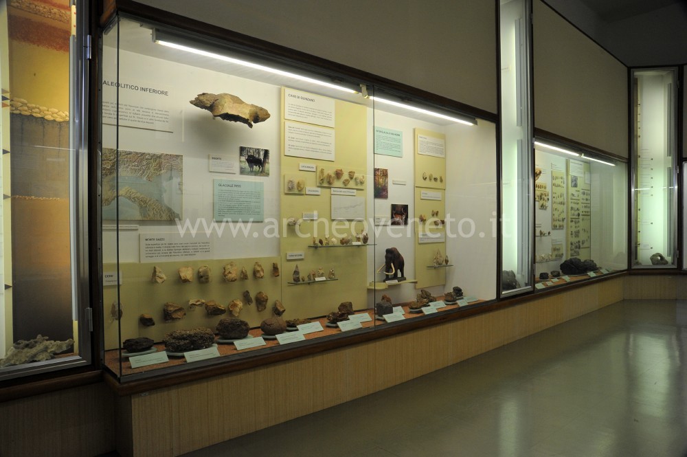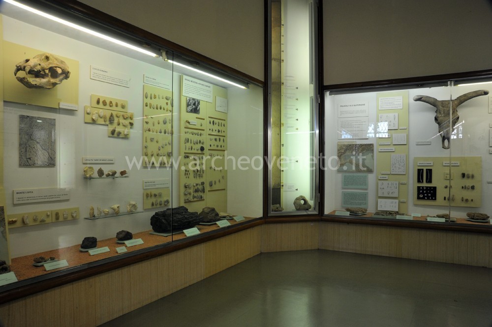 The room contains a rich collection of prehistoric finds discovered in the area surrounding Verona between the mid nineteenth century and the late twentieth century. The first display case regards the Lower Paleolithic (2.5 million – 120,000 million years ago) and contains items found in the caves of Quinzano (examples of flint tools and a human occipital bone), in Cà Pauli (bifaces) and in Lunghezzano (a biface and an Acheulan clay deposit).
