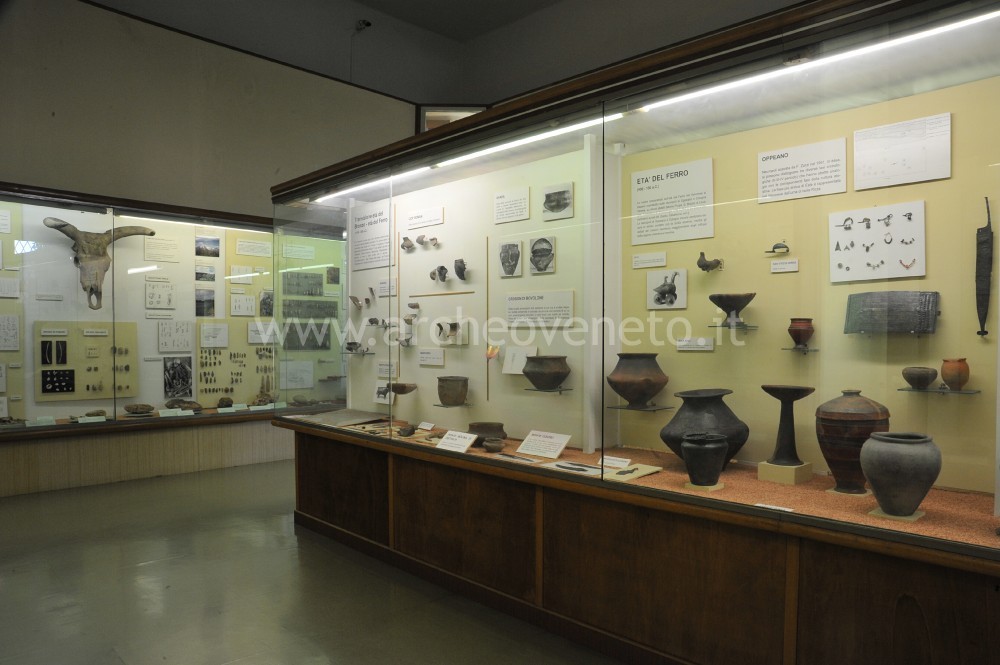 The last display case contains, in the first part, archaeological finds regarding the transitional period between the Bronze Age and the Iron Age, which were found in Copi Romani (pottery), Marano (ceramic material), Croson di Bovolone (urn and a quadrangular razor decorated with engraved stitches), Ponte Molino di Ostiglia (urn and accessory vessel) and Monte Tesoro (a knife of “Matrei” type). Information on the Iron Age has been provided by the finds coming from Isola Rizza (urn), San Briccio di Lavagno (ceramic and metal material and a fragment of a bronze situla), Oppeano (large banded vases, bronze situlae and grave goods belonging to the culture of Este and dating back to the 8th-5th cent. B.C.), San Vito di Cerea (boat-shaped fibulae), Campo Paradiso (bronze ornamental objects), Colognola ai Colli (dragon-shaped fibulae), Monte Loffa (numerous examples of ceramic and iron material) and Vigasio (sword of “La Tène” type).
