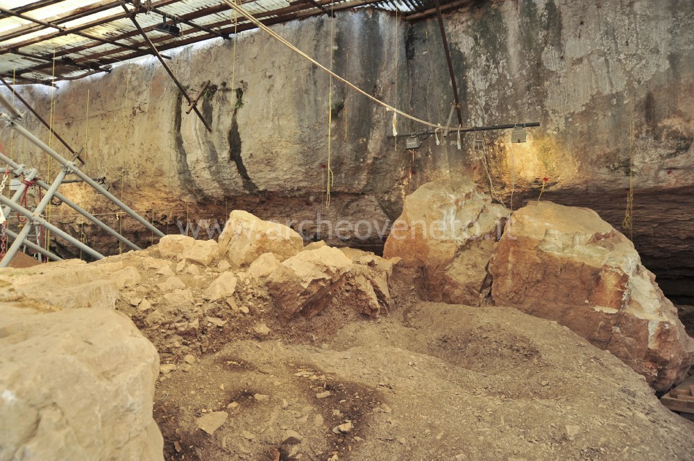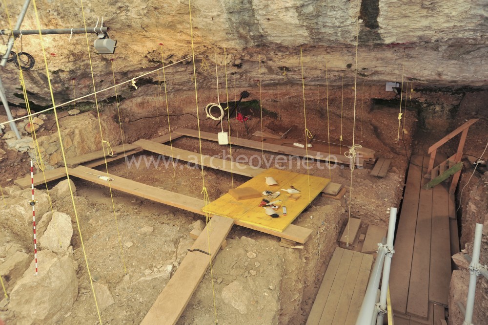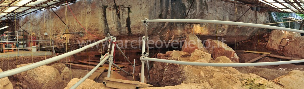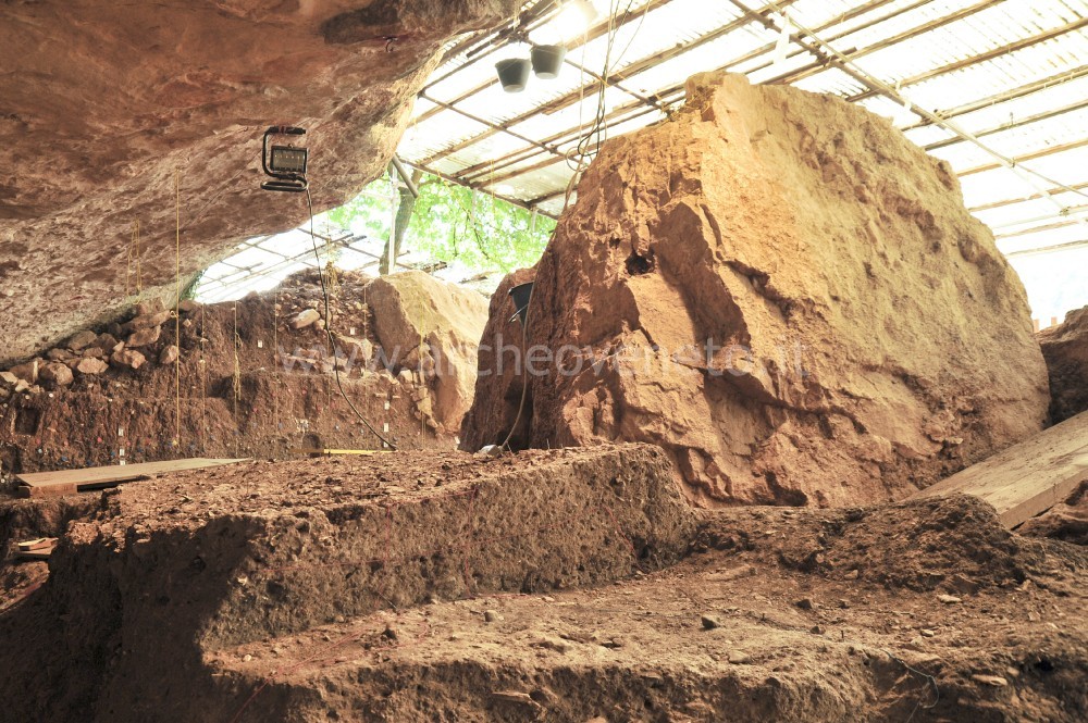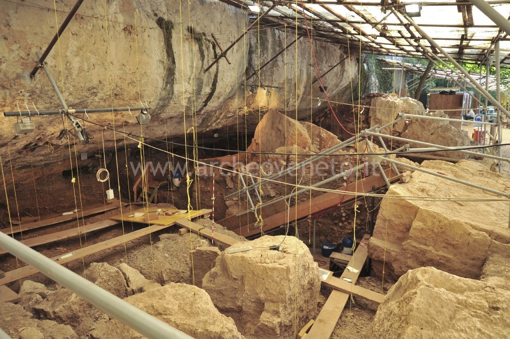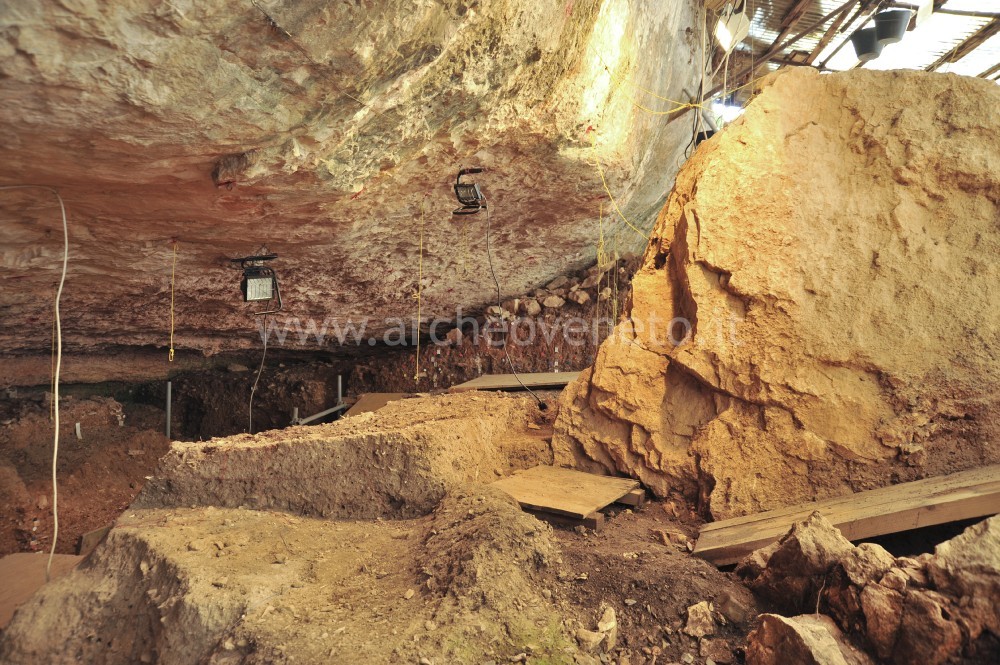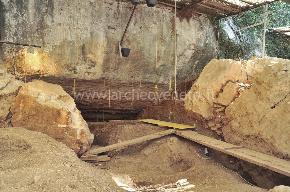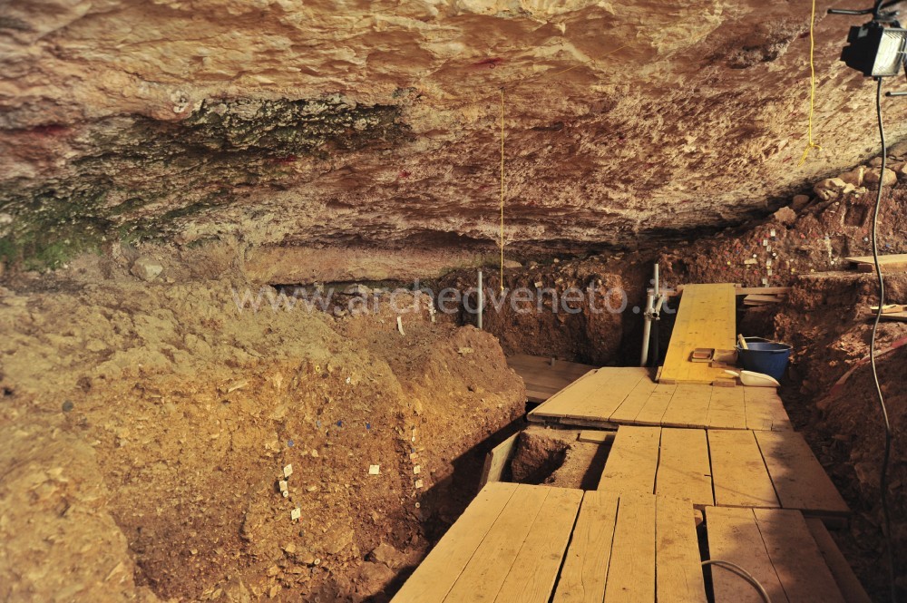 The deposits that have been found here document two phases in the use of the cave, which are separated by a layer of abandonment. The most ancient deposit spans between 60.000 and 30.000 years ago and is characterized by Mousterian and Aurignacian stone tools. The palaeoclimatic analyses suggest that this settlement phase corresponds to a full glacial cycle.