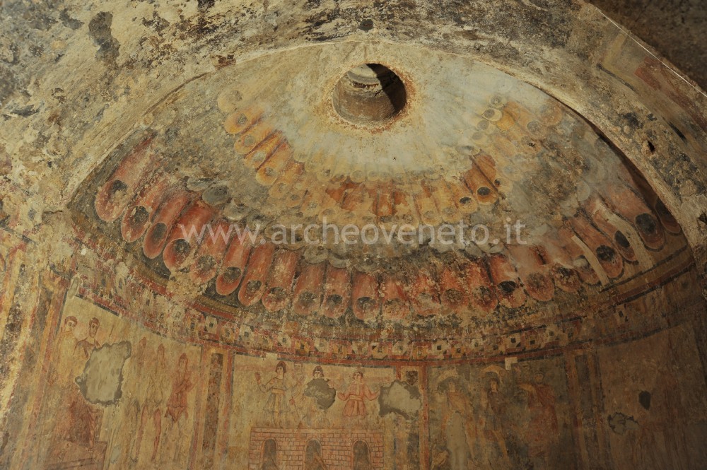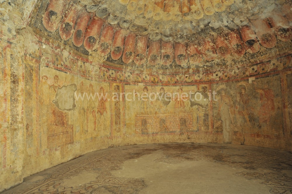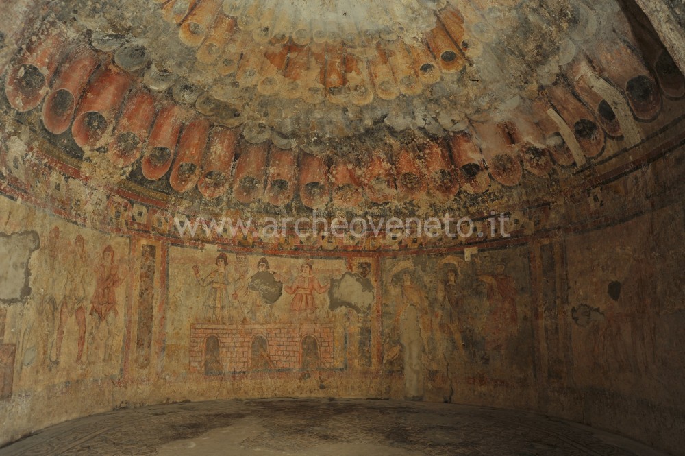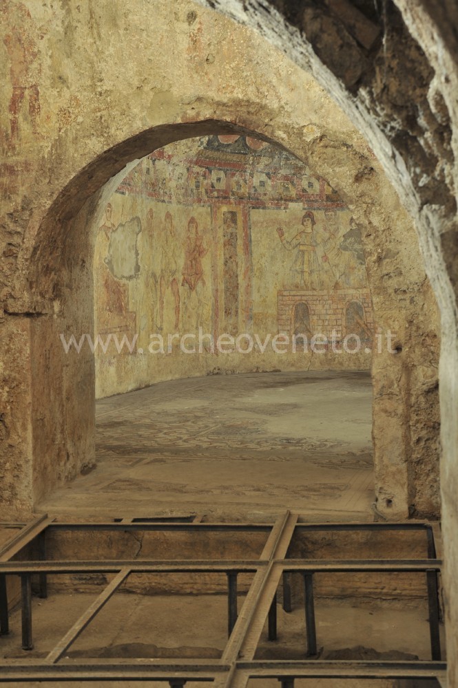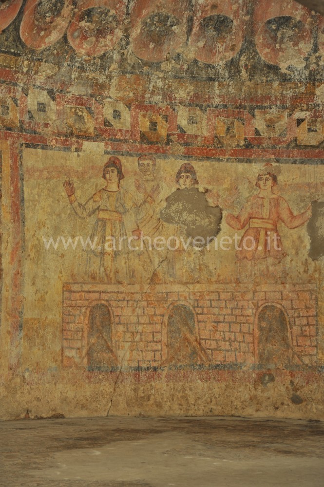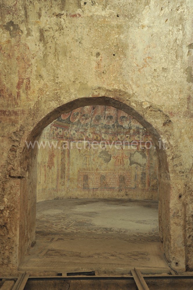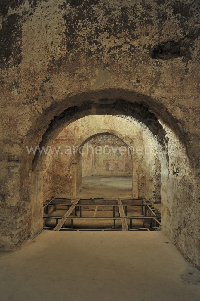 Then we enter a squared room (C) where we find a water tunnel (D) and an architraved opening (E) with the inscription recalling the person who built the hypogeum, Cornelianus, with his wife Julia Magia and his children Coriolanus and Magianus. Through the architrave door we move into a barrel vaulted corridor (F) that follows the natural path of the water and that leads to the water spring. This corridor is about 100 metres long and it is divided by wells into four parts. The first two parts are paved with stone slabs, whereas the following ones are more narrow and uncomfortable, with the water running in an open logline in the middle of the gallery. In the spring well the water is collected in a semicircular basin excavated in the rock, where the soil deposits. At about one quarter of the corridor there is a cross-shaped hall (G) with two large mirror cells (H, I) with apse and semi-domed ceiling. These cells were added between the IV and the VIII century A.D. when the hypogeum became a religious chapel. They are paved with mosaics and have fresco paintings displaying religious scenes, of which those in room H are the best preserved. The themes of the paintings, such as the slaughter of the innocents, the three young men in the furnace, the three young men in front of Nebuchadnezzar, Christ among the apostolic college, are drawn from the Old and New Testament and are among the most precious series of scenes in northern Italy.
