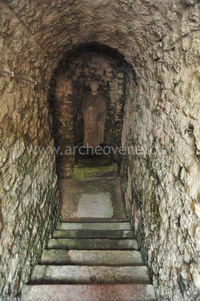 The access to the hypogeum is through some stairs (A), at the end of which there is a niche with the statue of a man wearing a toga (B). The man is most likely Publius Pomponius Cornelianus, who lived in the first half of the III century A.D. and who was well known in the Verona territory for having held public positions as an imperial officer. The statue is made of three distinct parts: the head, the body and the feet up to the ankles. The latter are believed to be the only original part of the statue.