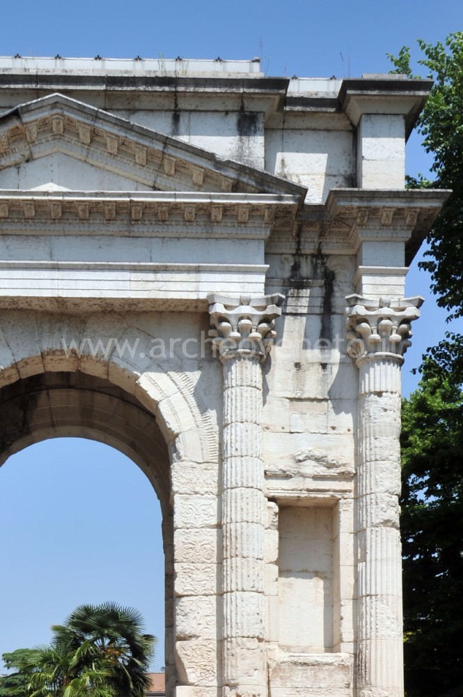 The archway is made of local limestone and it is four-fronted, thus allowing the passage across the road “Via Postumia” and between the two sidewalks. The two main fronts are decorated with four Corynthian semicolumns on plinths. The four passages are covered by coffered vaults and bear some inscriptions among which that of the architect “Lucio Vitruvio Cerdone”, the designer of the arch who in the past was mistakenly believed to be the famous architect of Augustan times. Other inscriptions celebrating the members of the “gens Gavia” are located at the bases of the niches facing the passage along the central arch.