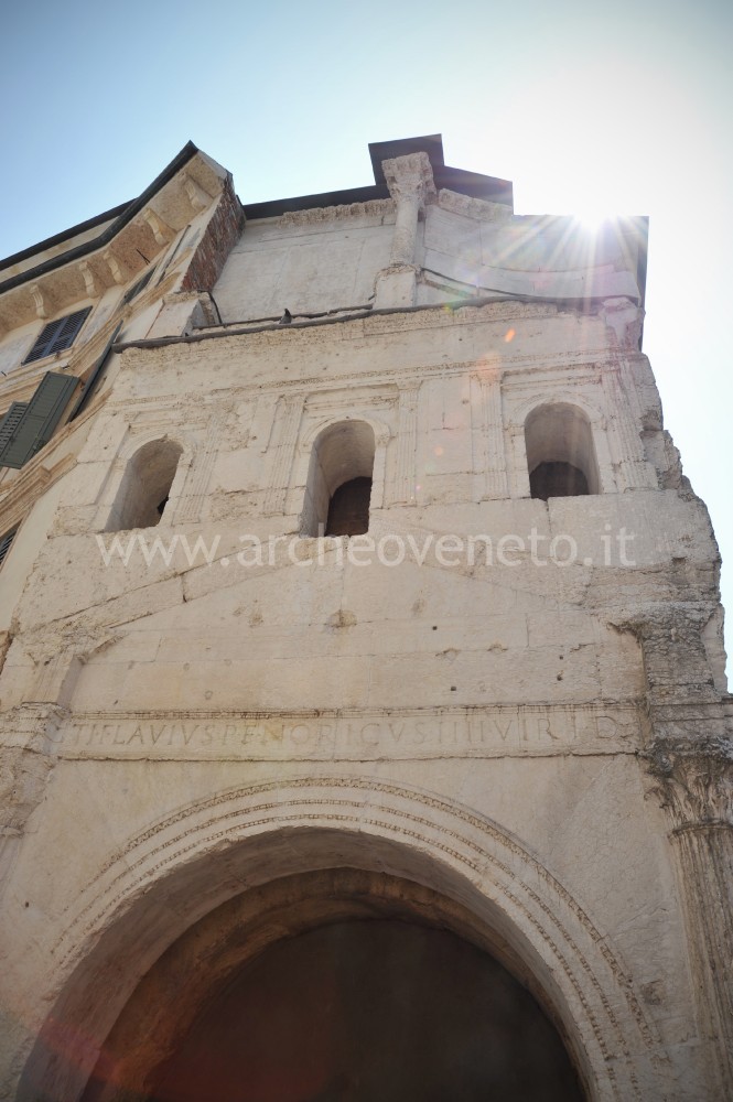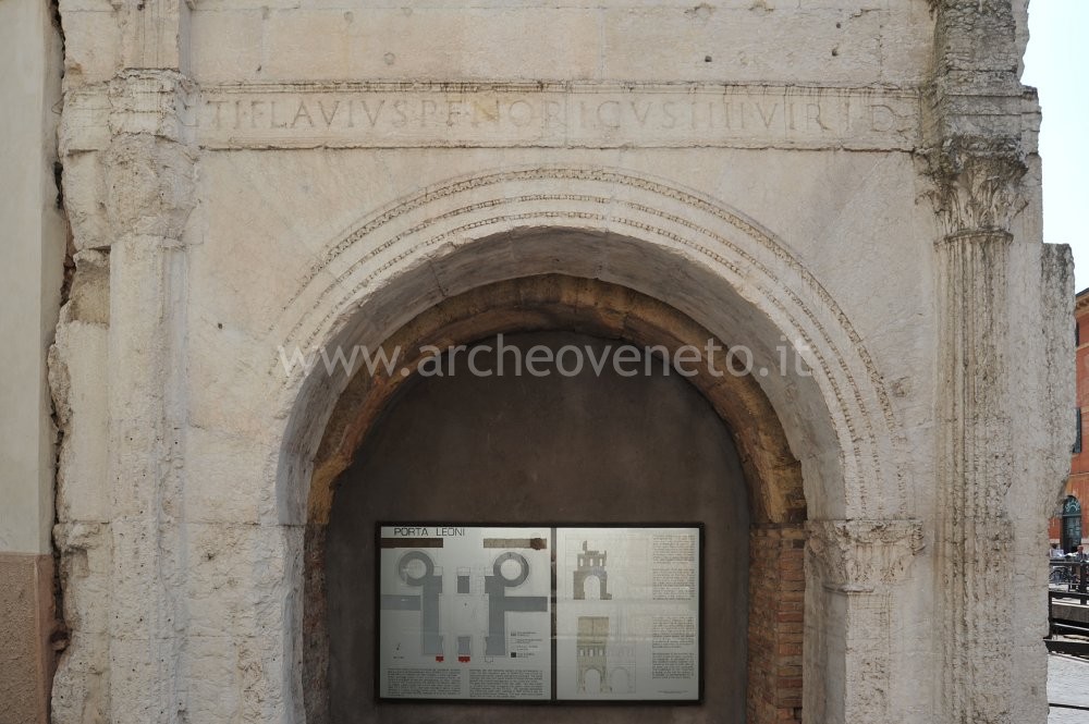The gate “Porta Leoni” was built between the I century B.C. and the I century A.D. and was the main city entrance at the end of one of the main urban road. It was 13 metres high and it had a squared plan (about 17 metres per side) with rectangular inner court. It also had a double front with arches about 3,3 metres high and galleries at the upper levels. The front towards the countryside had two polygonal towers, the foundations of one of which are visible in the archaeological area. The remains also include part of the front towards the city, with one arch only and three window-openings at the first level. This front also displays the inscription that reminds the door having been constructed at the same time as the city walls, the sewerage system and the roads.