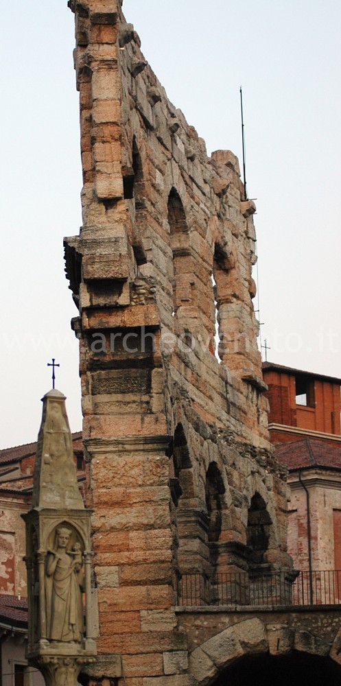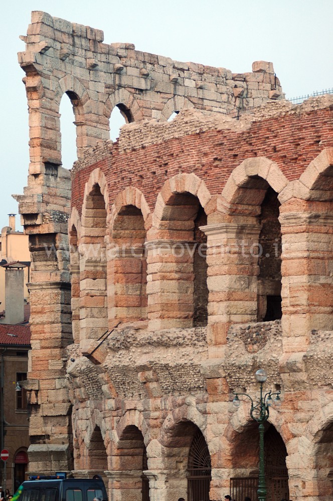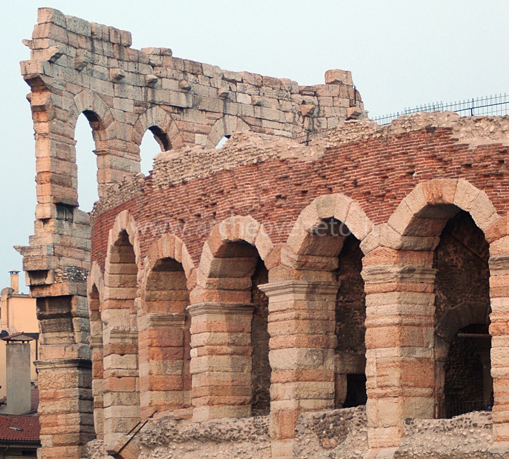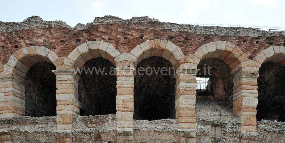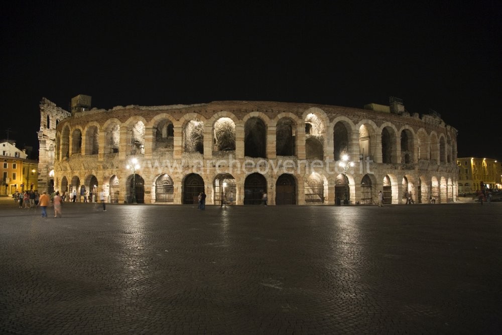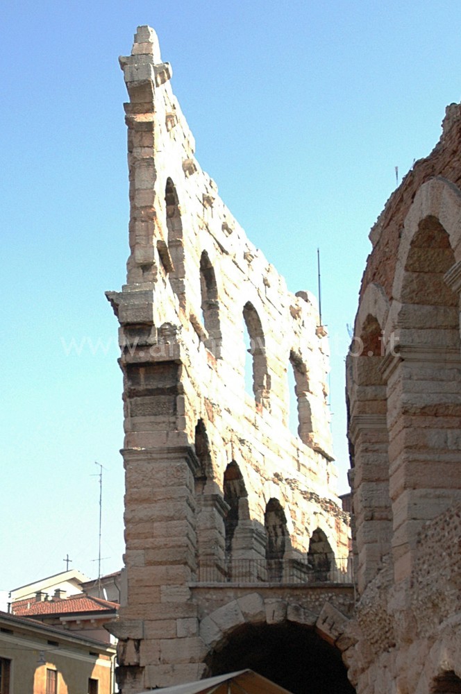 Verona is located along the Adige river, where this enters in the Po plain, at about thirty kilometres east to the Garda lake. Its altitude is 59 metres above sea level and it is placed at the basis of the Lessini mountains. The amphitheatre is located in the old town centre of Verona but it was included within the Roman city walls only in the Gallienan times (265 A.D.).