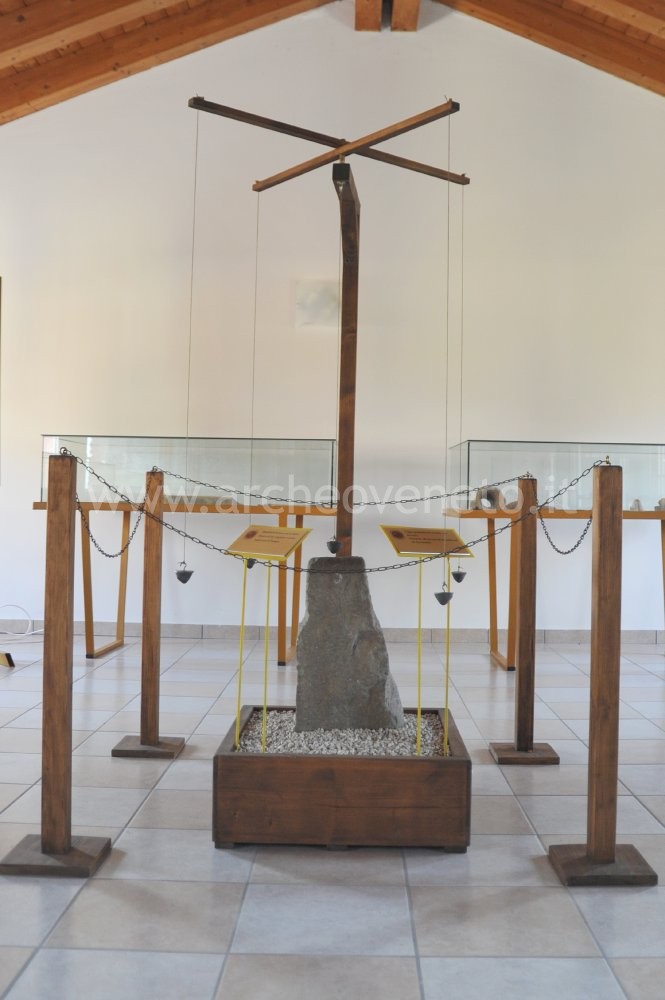 The most significant item of the collection is located at the centre of the room: it is a boundary stone, on the top of which the symbol of the Roman decussis is engraved. A wooden groma has been reconstructed (taking as model the one found during the excavation in Pompei) and placed on it, to highlight the importance and the function of this object.
