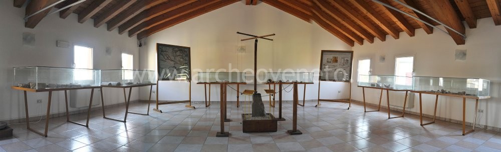 The visit to the museum starts with the presentation of four thematic maps, which on different scales show the interventions of land arrangement (centuriatio) carried out in the whole Bassa Padovana. The reclamation works were probably reiterated as many as three times throughout the 1st and 2nd centuries A.D. owing to a problem related to the water draining, as the pictures displayed on the panels clearly show. The rest of the room hosts a set of display cases, which contain finds related to building (fragments of floors, plaster, mosaic tiles, bricks of different sizes, stamped bricks), domestic activities (fragments of amphoras, ollas and paterae, loom weights, fragments of grey and sigillata pottery, two fragments of a brick on which the game of nine men's Morris is engraved) and funerary practices (fragments of a funerary urn containing some bone remains, a lachrymatory, a sigillata vessel and a coin of the emperor Gallienus of the 260 A.D:).