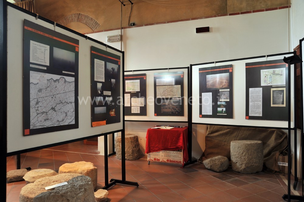The first section of the room is devoted to the topic of centuriation. Panels and aerial photographs explain the role of surveyors, the features of centuriation and its function. As the exhibition goes on, panels provide more detailed information, focusing in particular on the case study of Adria and Villadose and they are accompanied by trachyte stones discovered thanks to the field walking activities carried out in the site Livello (Villadose). Then an explanation is provided on the methods adopted to investigate this specific archaeological context through systematic activities of field survey and the interpretation of the aerial photographs, which have led to the discovery of ancient roads that had been buried and of old field divisions.