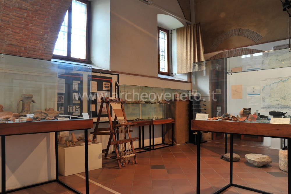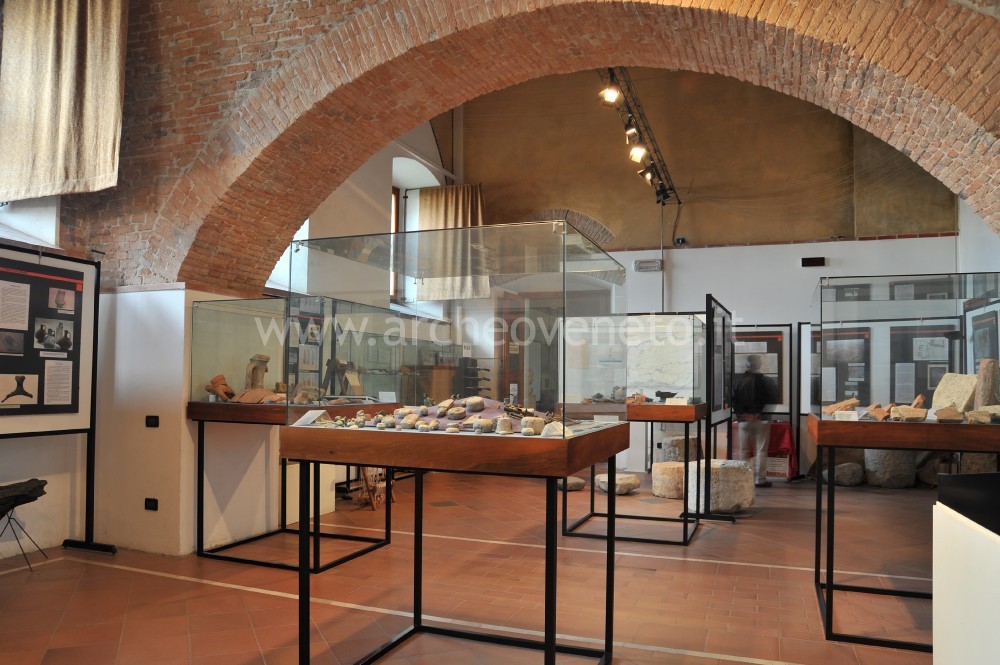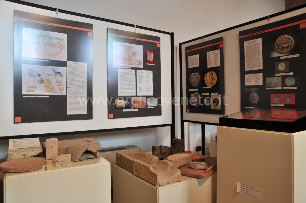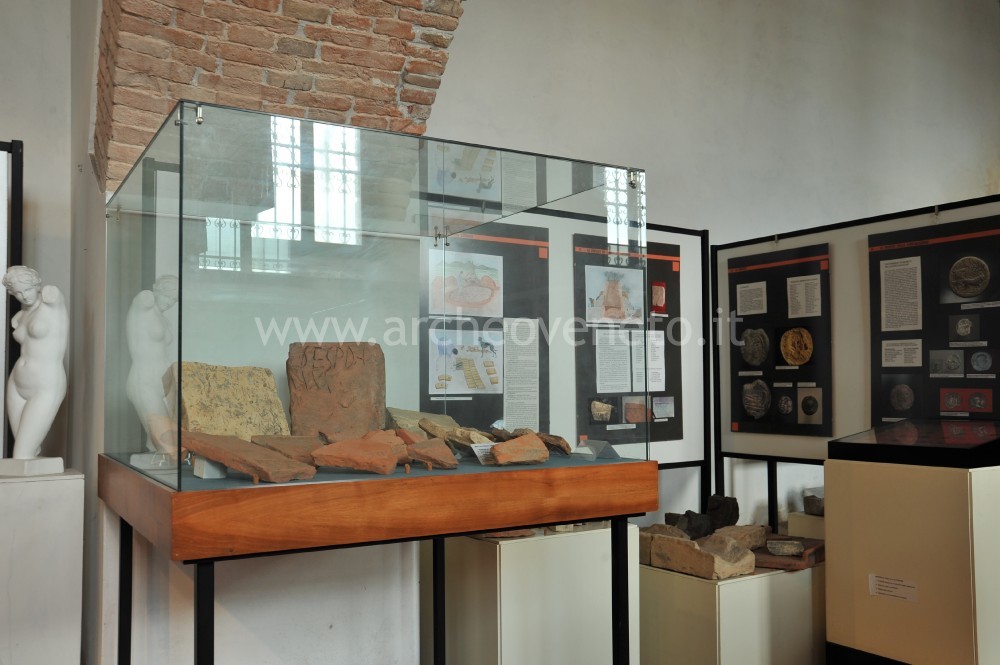 The second last display case contains finds of the Roman period (small bronzes and iron tools), whereas the last one displays materials related to the civilization of Veneto from about twenty sites, which at a later stage, were occupied by settlements linked to the Roman centuriation. Here it is possible to see grey pottery, small bronzes portraying devotees, horses and praying people, votive tablets, a miniature helmet of Veneto, a Venetic drachma of the 2nd cent. B.C. and a small bronze head from the site Cagna.