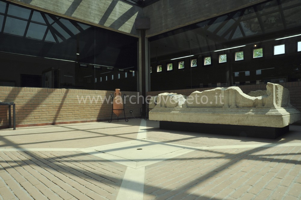 Inside the roofed courtyard it is possible to see some of the finds discovered during the excavation in the roman villa of San Basilio, which include building materials (tile, weight, bricks, pipes, an uncertain column portion and a soft stone Ionic capital decorated with bucrania and garlands), funerary items (an inscribed stele and an impressive architectural marble sarcophagus of the 2nd-3rd cent. A.D. bearing an inscription from Pinnia Clementina together with the daughters Plauta and Plautina to the husband and father) and fictile tools (two transport amphoras of the Dressel 6 type). The small amount of materials displayed bears witness to the hypothesis that the excavated area belonged to the most rustic and productive part of the villa.
