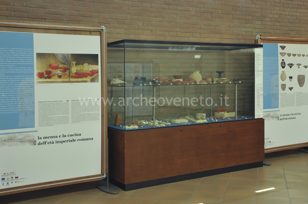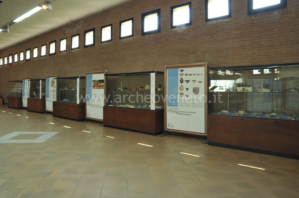 The first phase regards the settlement inhabited by Etruscan and Greek communities and people from Veneto in a period between the early 6th cent. and the late 5th cent. B.C., which was mainly characterized by commercial activities, in which the centre acted as intermediary in the trade relations between the peoples of central and eastern Europe and the Etruscans inhabiting the Po valley. The display case contains examples of Etruscan bucchero and of Etruscan pottery coming from the Po valley (made of purified clay of a light colour), a set of Attic black figure ceramic finds, Corinthian earthenware and ollas of different sizes made of coarse clay. The rich variety of the finds bears witness to the clear multicultural tradition that the settlement developed.