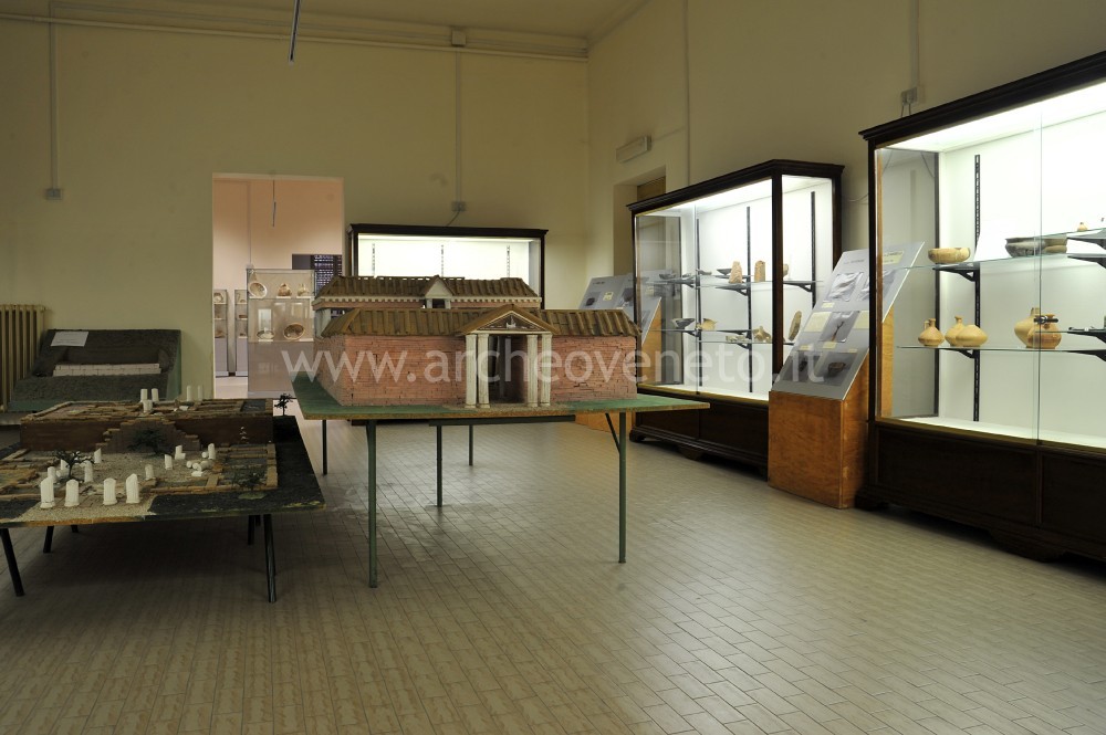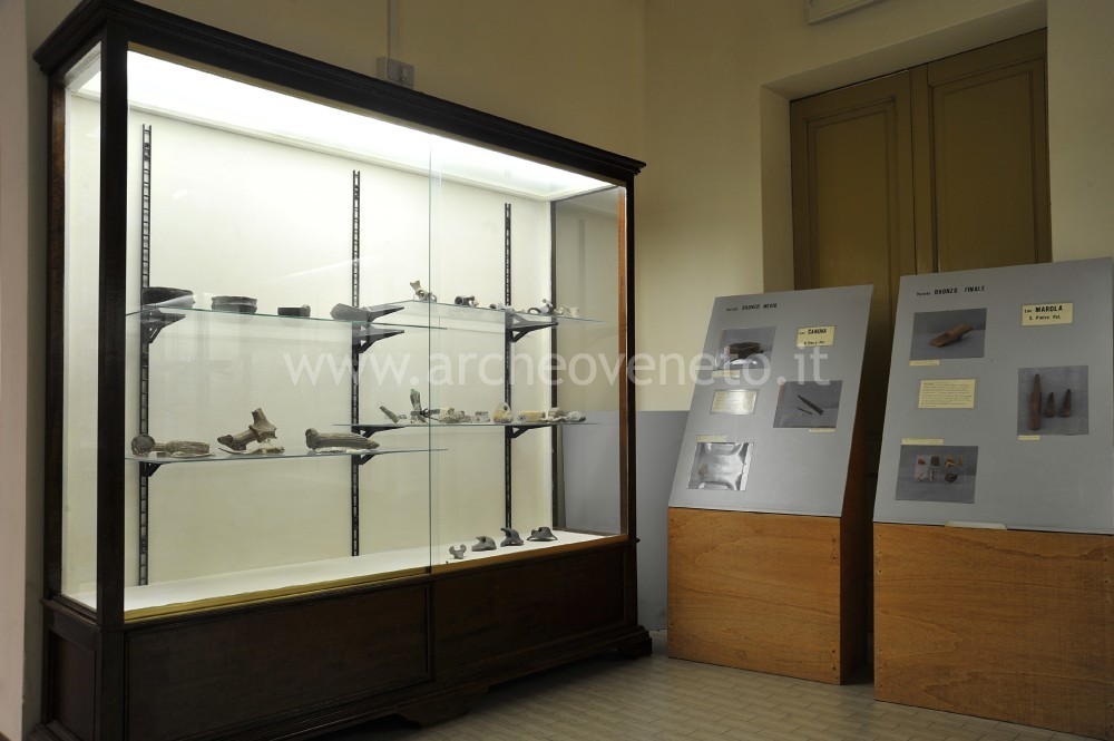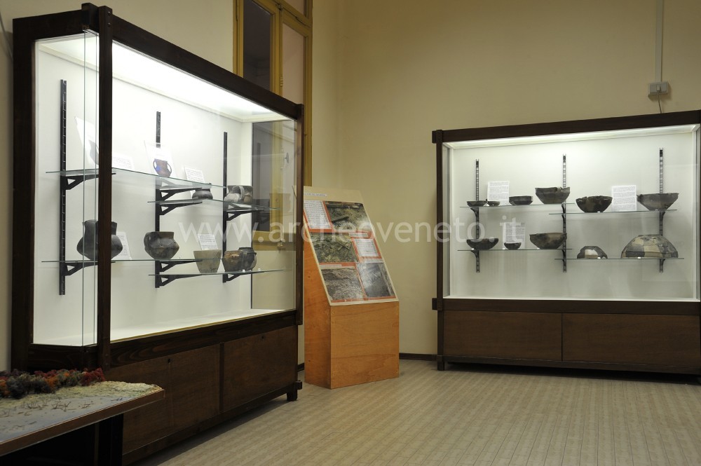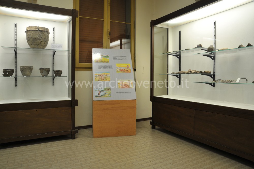 The first room is completely devoted to the prehistoric settlement in Canàr, which developed during the early Bronze Age in the Polesine area near the municipalities of Castelnovo Bariano and San Pietro Polesine. The visit to the museum starts with a panel providing information on the geo-morphological characteristics of the area, to enable the visitors to understand the reasons leading people to decide to settle there. Next to it there is a scale model showing how the Terramare village looked like (huts built on piles). The following display cases contain mainly earthenware; indeed it is known that the most important domestic activity carried out in this site was the production of earthenware. Some objects typical of this area are the large truncated conical vases, jugs, biconical cups of different sizes, large bowls with cover and carinate basins, similar to those that can be found either in the contemporary Polada culture or in the Wieselburg-Gata culture, in the Danube area.