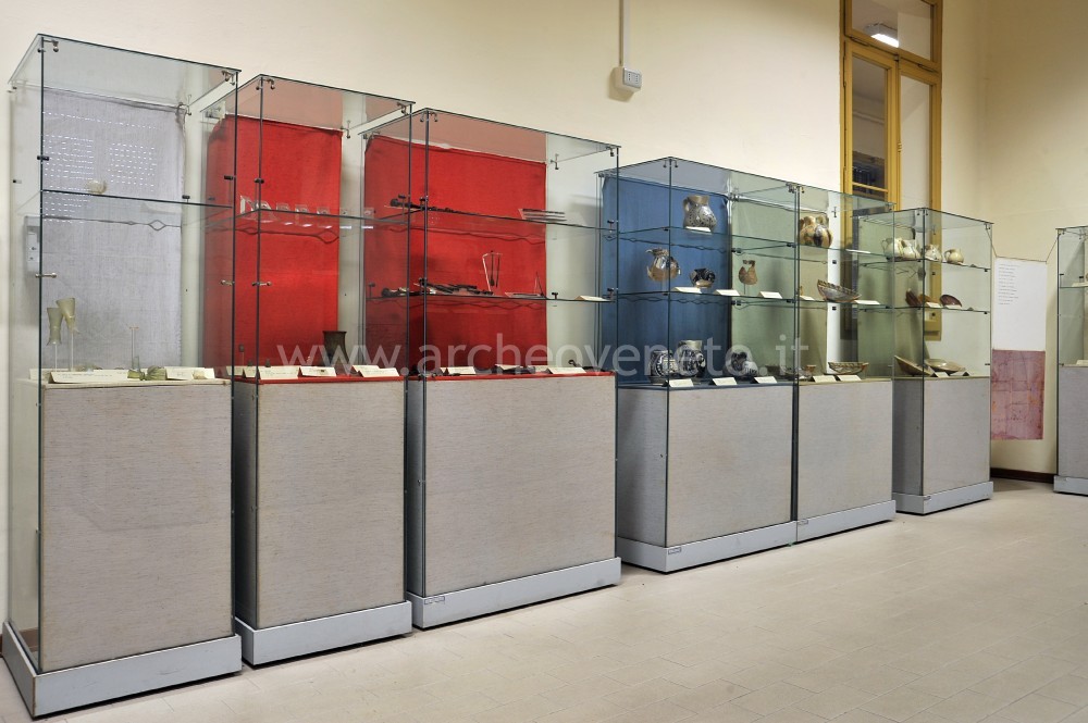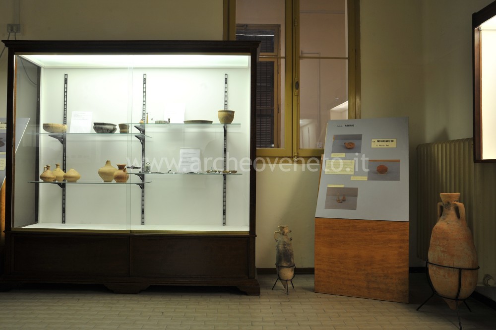 The second section of the room displays items of the Iron age from the site Stanghelle and of the Roman period from the site Mondonuovo. The materials dating back to the pre-roman phase include a light brown ceramic pot, fragments of black varnish pottery, ladles of the “bucchero” type and a plate used as mortar. As regards the finds of the Roman age, it is important to highlight the presence of loom weights with different iconographic motifs, the fragment of a male statue in light coloured stone, the fragment of a stamped tile, the fragment of a bicolour floor mosaic, an oenochoe, a carinate vase with comb decoration, an unguentarium, a zoomorphic foot of an ivory box, a pin head depicting a cock head, a thin-walled bowl, lamps, fibulae, a bronze spoon, a bronze mirror handle, needles a bone stylus and a numismatic collection of bronze coins.