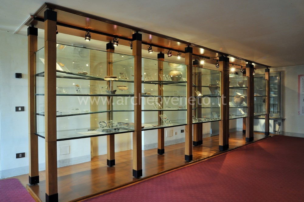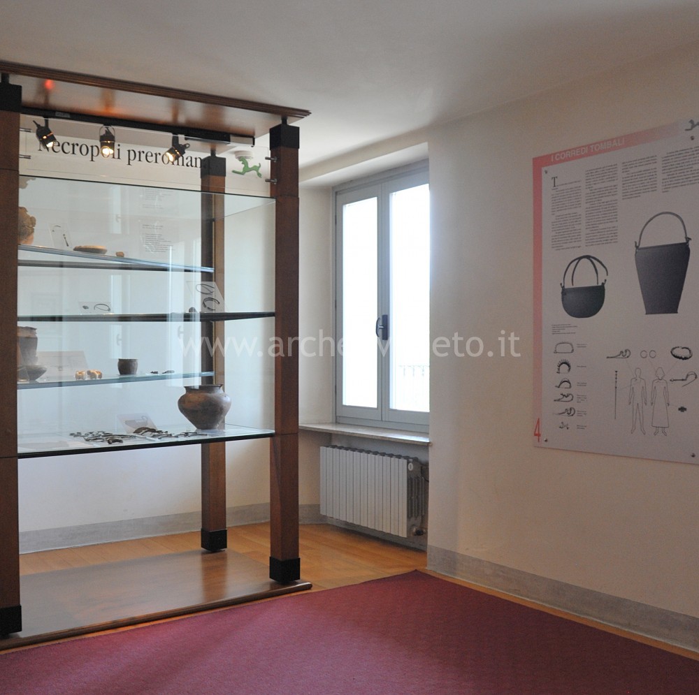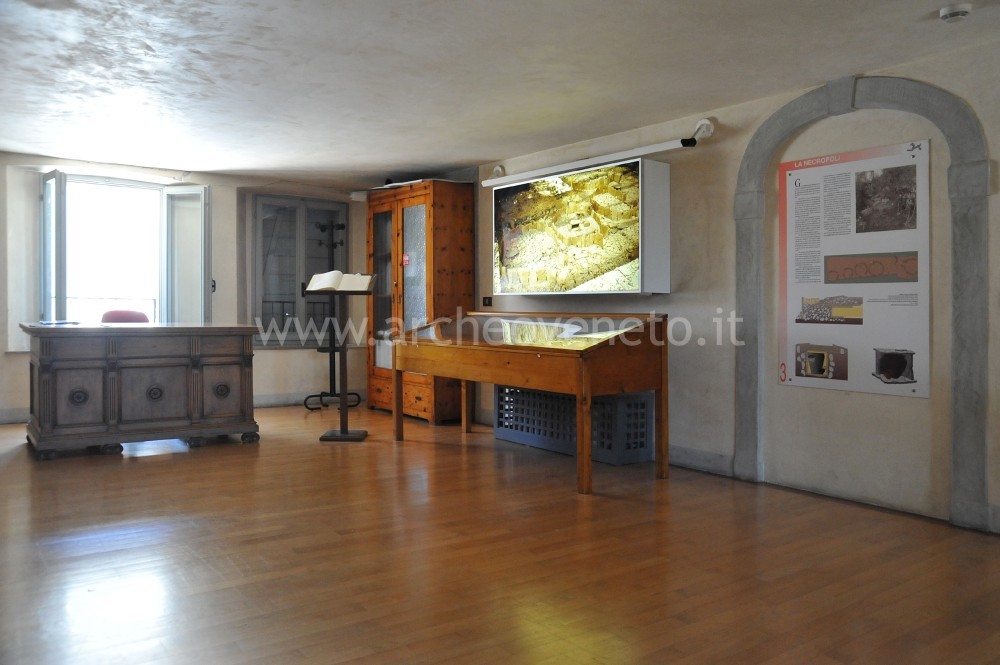 La prima sala, a destra dell’ambiente di ingresso, è interamente rivolta all’esposizione delle decine di corredi funerari rinvenuti nella necropoli preromana a cremazione di Mel, ai quali sono dedicate le undici vetrine disposte sui lati lunghi e i due pannelli illustrativi collocati lungo i lati brevi. La visita inizia con il corredo della tomba 25 (fine del IX-inizio dell’VIII sec. a.C.), esposto nella prima delle sei vetrine sulla destra, procede con criterio cronologico in senso antiorario e si conclude con i corredi contenuti nelle ultime due vetrine sulla sinistra, datati tra la fine del VI e la metà del V sec. a.C. Tra i molti manufatti esposti si distinguono vasi ossuari in bronzo (situle, lebeti e ciste) e in ceramica (situle e olle), oggetti di ornamento personale come spilloni, anelli, pendagli, ganci decorati di cinture, armille e fibule di varie tipologie (“ad arco costolato”, “ad arco ribassato”, “a navicella”, “a drago con cornetti”, “a sanguisuga”, “ad arco figurato”, come la particolare fibula “ad arco configurato a felino” della tomba 76, risalente alla metà del V sec. a.C., scelta quale simbolo del museo), ma anche strumenti d’uso quotidiano, come coltelli, punteruoli, fusaiole e aghi per la filatura. I corredi funerari rivestono un notevole interesse non solo dal punto di vista storico-artistico, ma anche sotto l’aspetto rituale e quello socio-economico (sesso, età, rango sociale ecc.).