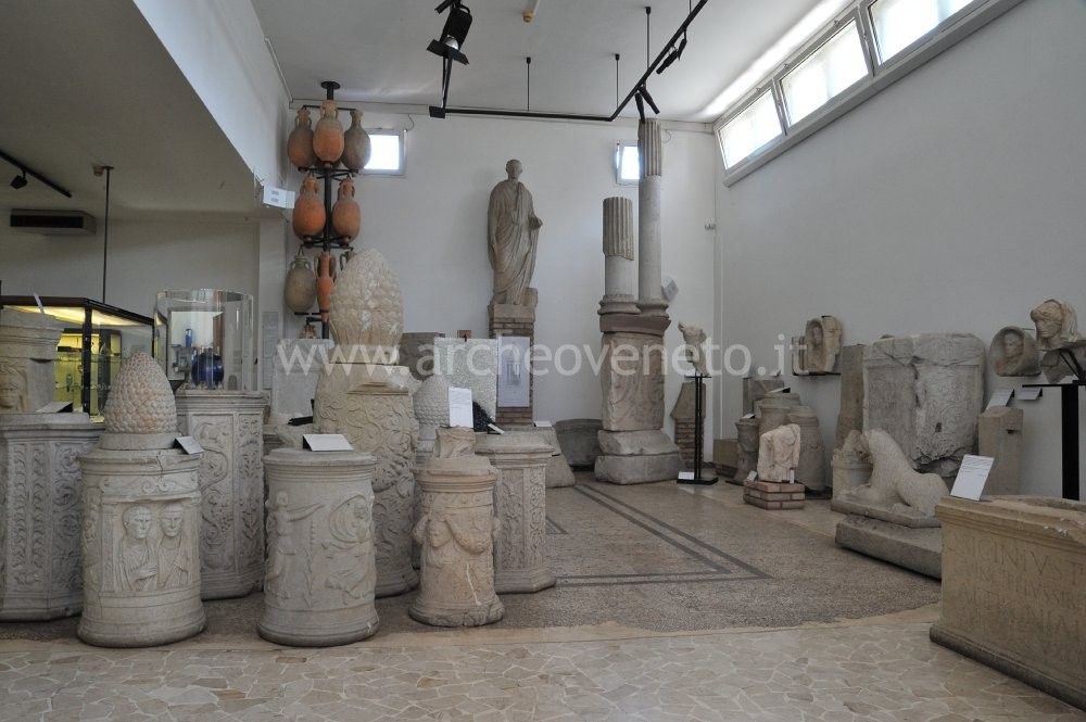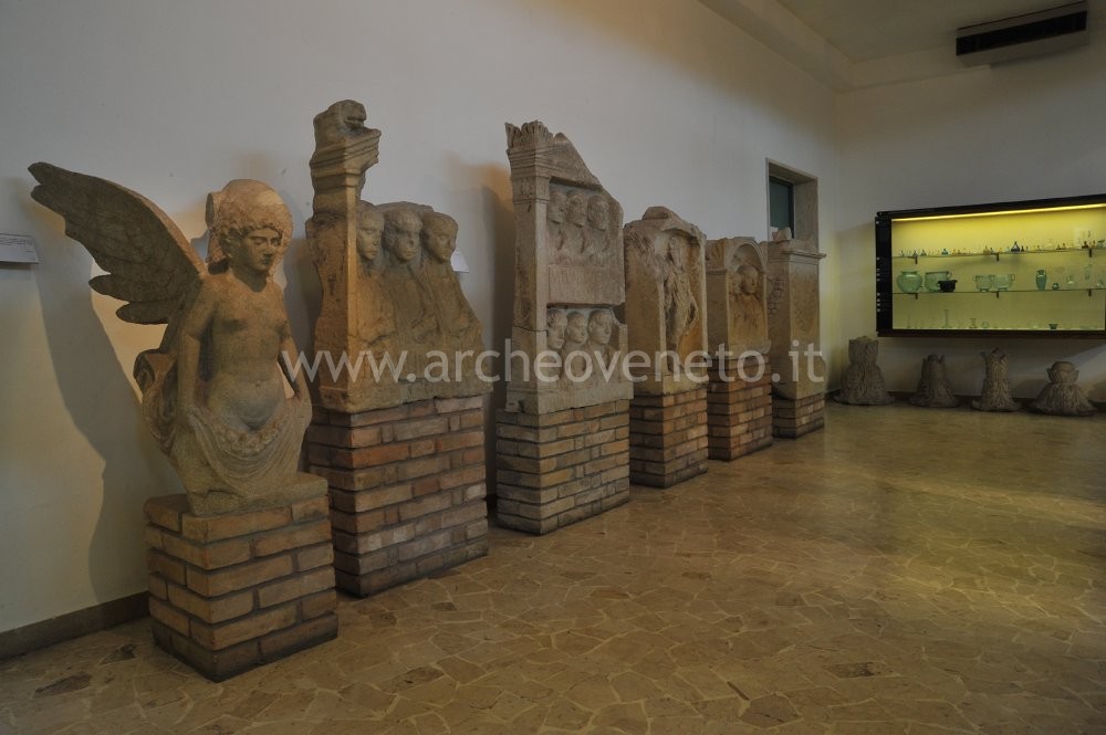 Sulla parete di fondo a sinistra si collocano due poderose statue acefale di Giganti, che dovevano coronare la sommità di un monumento funerario della necropoli S-O dell'Annia. Al centro della sala è collocato un gruppo di sculture composto da una statua femminile panneggiata frammentaria in marmo, una statua frammentaria di Dioniso in marmo, un torso di divinità marina in calcare e una statua frammentaria di Sileno in marmo. Sulle due mensole della parete di fondo sono esposti altri ritratti pertinenti a statue funerarie o racchiusi all'interno di un'edicola o clipeati. Lungo la parete di fronte alla porta d'ingresso sono esposte alcune stele funerarie a pseudoedicola, di cui due associate alle relative urne a cassetta. Sulla mensola di sinistra della stessa parete trovano posto alcuni frammenti di fregi appartenenti all'apparato decorativo di monumenti funerari e due elementi decorativi da giardino provenienti dall'area urbana. Sulla mensola di destra è allineata una serie di teste-ritratto relative a stele o a monumenti funerari, ad eccezione del grande ritratto di dama di età flavia proveniente dall'area urbana. Lungo le pareti della sala e sotto le vetrine si allineano urne-ossuario e relative coperture-coronamento: peculiari di Altino sono i coronamenti costituiti da una semisfera poggiante su plinto, su cui corre l'iscrizione che spesso proseguiva sull'urna a cassetta.