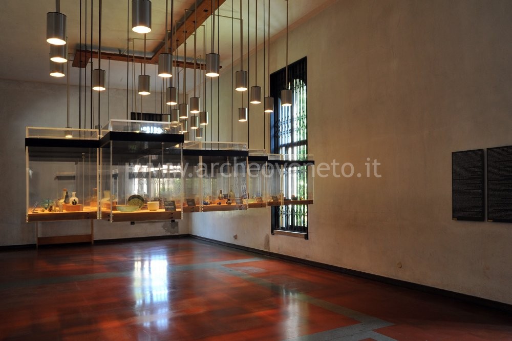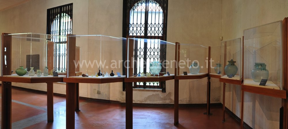 La visita inizia con le teche presenti all’ingresso della sala. A sinistra è esposto un corredo funerario, parzialmente ricostruito, da Salizzole (Verona), risalente al I sec. d.C. Procedendo invece sulla destra, s’incontra una vetrina contenente collane di perle in vetro fuso (I sec. d.C.), anelli e bastoncini sempre in vetro fuso (I-II sec. d.C.) e altre collane di perle in vetro fuso e soffiato (I-IV sec. d.C.). Seguono quattro teche nelle quali spiccano altrettante olle cinerarie vitree di grandi dimensioni, datate alla prima età imperiale; fra questi espositori, quello maggiore contiene il corredo quasi completo di una tomba di Aenona, in Dalmazia (I-II sec. d.C.), comprensivo di piccoli contenitori in vetro e in ceramica e di una lucerna.