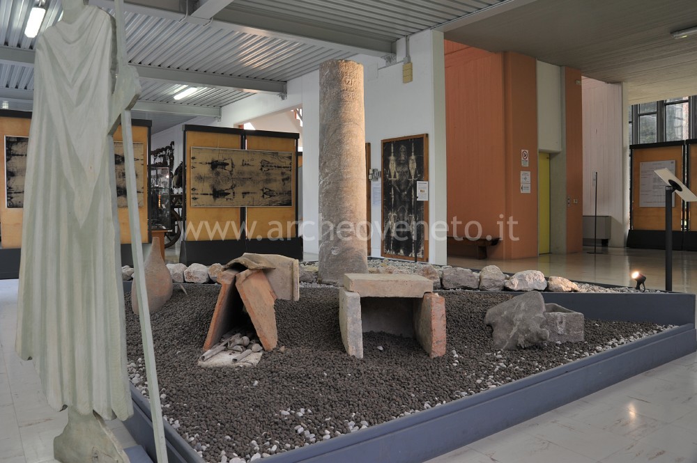 All’interno della vetrina sono presenti numerosi frammenti di ceramica grigia (coppe, ciotole-coperchio, brocche e grandi olle) con iscrizioni venetiche (IV-II sec. a.C.), etrusche (IV sec. a.C.) e latine (II-I sec. a.C.), pareti di grandi dolii decorate con cordoni a rilievo (V-III sec. a.C.) e frammenti forati della camera di cottura di un forno (IV-II sec. a.C.), da Fossà, località Cà Treviso.