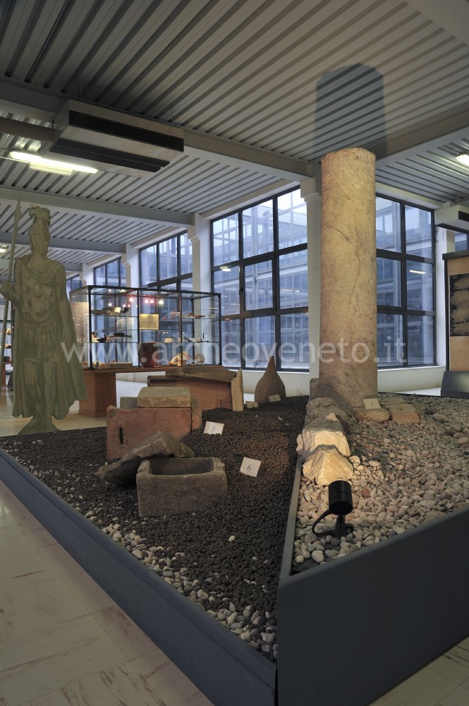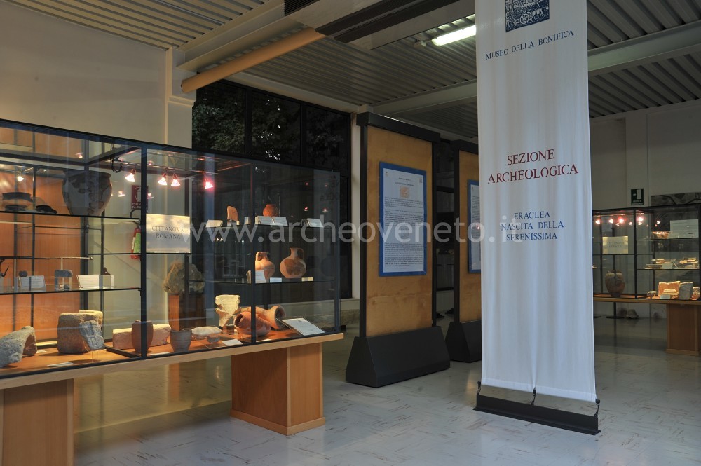 L’ultima parte della sala è riservata al sito di Eraclea Veneta–Cittanova, dove la presenza antropica ebbe inizio durante l’età del Bronzo e continuò fino al periodo del dominio della Serenissima. Alla fase romana di questo sito è dedicata un’intera vetrina, all’interno della quale sono raccolti diversi frammenti di olle in ceramica da cucina (I-II sec. d.C.), colli di anfore “Dressel 6” (I-II sec. d.C.) e di produzione egea (III-IV sec. d.C.), olpi, coppe e patere in ceramica sigillata nord-italica (I-II sec. d.C.) e africana (IV sec. d.C.), elementi fittili forati per condutture idriche, tessere di un tessellato pavimentale, una cornice architettonica decorata con modanature (I-II sec. d.C.), un mattone fittile dal profilo arcuato per la canna di un pozzo (I-II sec. d.C.), una stadera in bronzo con asta graduata (I-II sec. d.C.), pesi in piombo per reti da pesca e per bilancia, mortai in pietra calcarea e un frammento di edicola funeraria con iscrizione (I sec. d.C.).