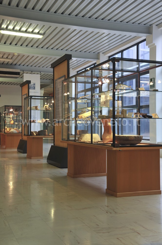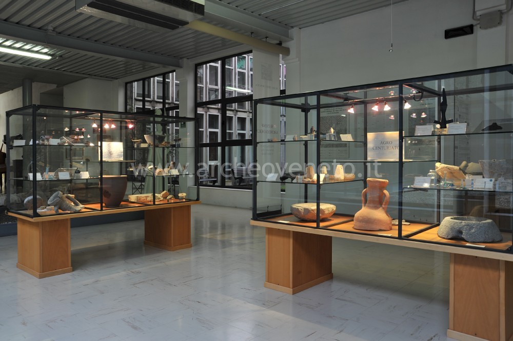 I reperti contenuti nella vetrina successiva provengono da diverse località comprese nell’agro centuriato a sud di Oderzo (cui si riferisce un pannello); tra questi vi sono frammenti di un’olla protostorica e di una lamina votiva (IV-III sec. a.C.), un basamento di candelabro in bronzo (I sec. d.C.), diversi pesi in piombo per stadera (I-II sec. d.C.) e in terracotta da telaio e per reti da pesca, una lama di vomere d’aratro in ferro temprato (I sec. d.C.), una porzione di macina in pietra, un collo d’anfora olearia “Dressel 6” (I-II sec. d.C.), alcune tegole bollate (I-II sec. d.C.), una lastra architettonica in pietra decorata con motivo vegetale (I sec. d.C.), un vago di collana in pasta vitrea (I-II sec. d.C.), alcune coppe baccellate e balsamari in vetro soffiato (I-II sec. d.C.). Accanto ai pannelli che illustrano i vari aspetti della centuriazione, è presente la riproduzione di una groma, lo strumento usato dai Romani per tracciare sul terreno gli allineamenti ortogonali dell’agro. Si segnala poi la teca che raccoglie una nutrita collezione numismatica, composta da monete, per la maggior parte provenienti da Fossà e Cittanova, che coprono un arco cronologico compreso tra l’età repubblicana (II-I sec. a.C.) e il V sec. d.C.