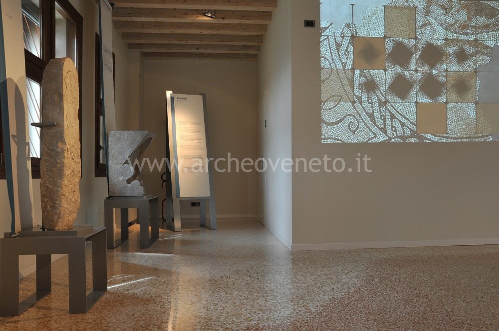 Appena entrati nella sala al piano terra si incontra una grande pianta, che illustra i principali rinvenimenti archeologici della colonia di Iulia Concordia e permette al visitatore di focalizzare le aree in cui, ancora oggi, sono visibili gli importanti resti della città romana. Accanto a questa pianta sono presenti il mosaico bicromo a motivi geometrici scoperto in una domus nell’area sud-occidentale dell’antico abitato (I sec d.C.), un fianco di seggio funerario con bracciolo sagomato a delfino proveniente dalla necropoli occidentale, località Levada (I sec. d.C.) e un vaso baccellato ornamentale dalla necropoli in località San Giacomo (I sec. d.C.).
