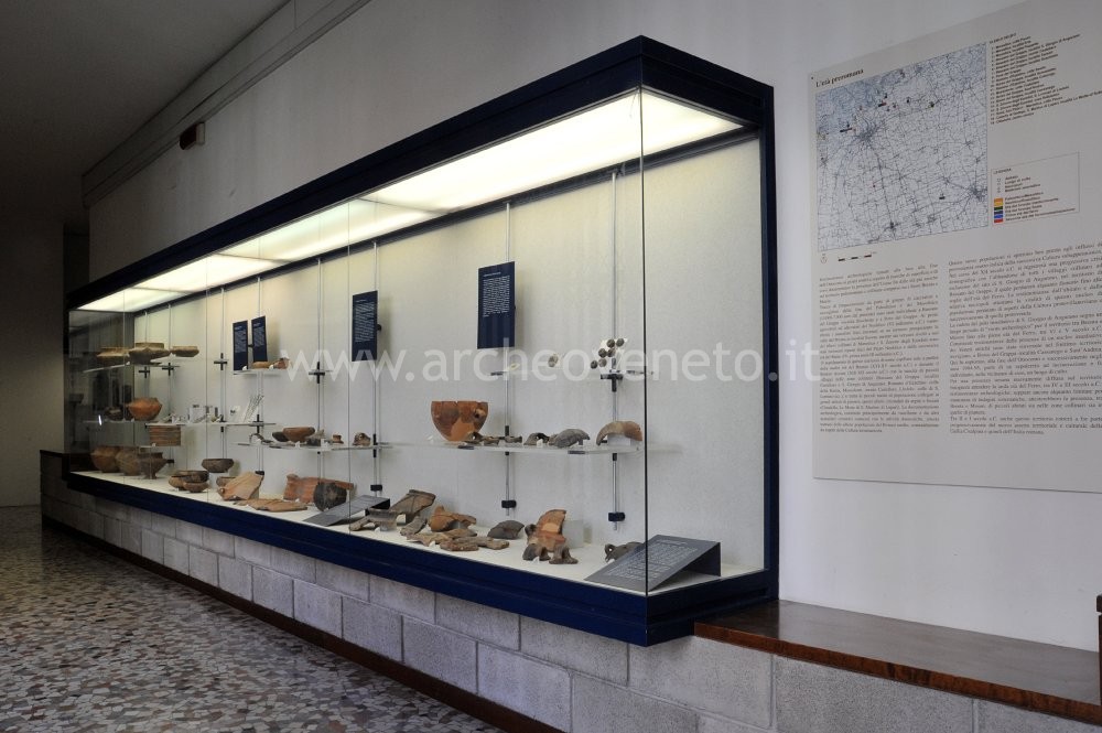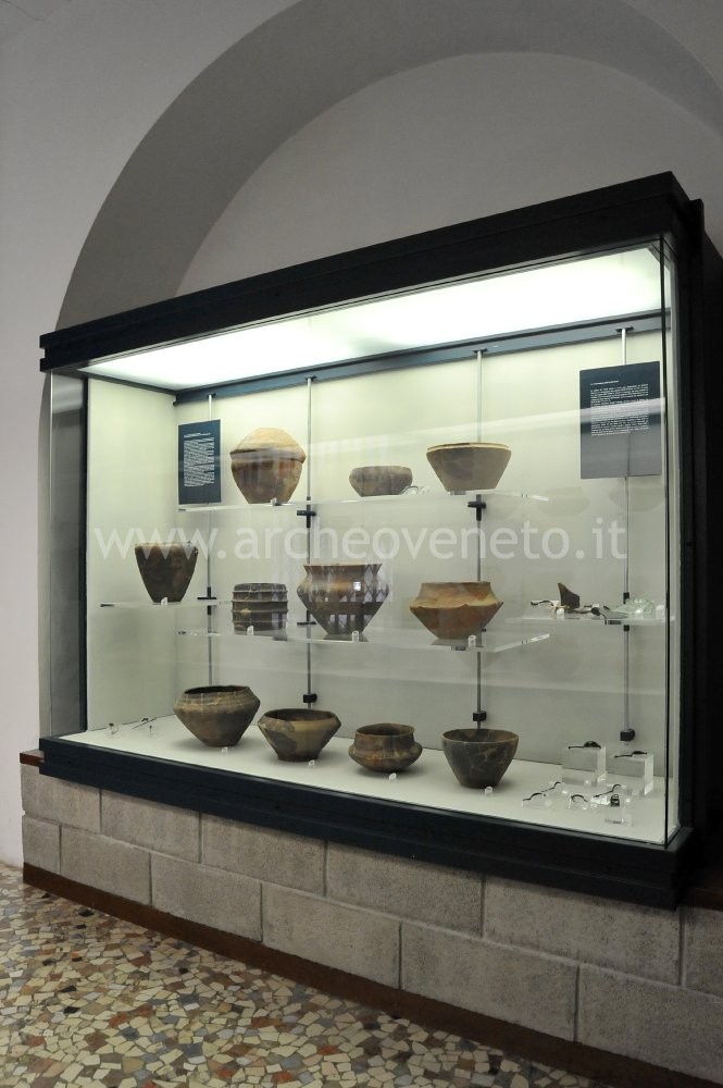 Nella prima parte della grande vetrina sulla destra sono raccolte le testimonianze provenienti da due piccoli centri del Bronzo medio, sorti nelle zone collinari e collegati ai più grandi villaggi della pianura: l’abitato di Liedolo-colle San Lorenzo e quello di San Giorgio di Angarano. Dal primo proviene un’abbondante quantità di vasellame domestico ad impasto grossolano (olle, anse verticali a nastro o a bastoncello, scodelloni, frammenti di dolii e di vasi biconici), alcune anse con terminazioni lunate o a corna tronche, fusaiole, rondelle fittili e una punta di freccia in selce. Dal nucleo dell’abitato più antico di San Giorgio di Angarano (Bronzo recente), caratterizzato da aspetti della Cultura subappenninica, giungono a noi soprattutto contenitori ceramici di uso domestico, quali olle, dolii e grandi ciste cordonate con grosse prese. Durante il Bronzo finale l’abitato si spostò in un’area terrazzata collinare posta più a sud, dove sono stati rinvenuti manufatti in terracotta connessi sia alla cottura sia al consumo dei cibi, nonché una fibula bronzea decorata.