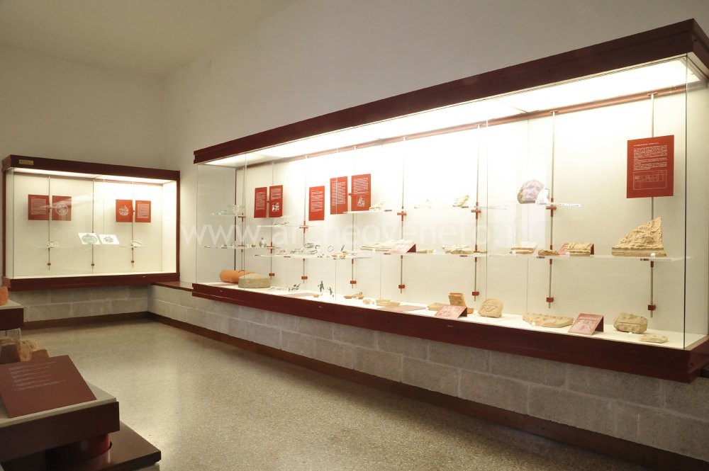 Di fronte è posta un’ampia vetrina che custodisce terrecotte architettoniche, materiale metallico e vetri probabilmente provenienti da ville rustiche sparse nella zona. Le terrecotte architettoniche esposte (lastre Campana, lastre di coronamento, sime e antefisse) provengono tutte da San Giorgio di Angarano e sono di età augustea. Queste forniscono un significativo campione della varietà presente nei repertori decorativi: scene legate al mondo dell’epica, del mito e della religione (Apollo citaredo e Nike sacrificante, scene del ciclo bacchico) e semplici motivi vegetali decorativi (palmette, tralci, cespi d’acanto e spirali). Tra il materiale metallico esposto ricordiamo una fibula a tenaglia del I-III sec. d.C., una fibula a croce latina del III sec. d.C., un’armilla con terminazione a testa di serpente da Bassano, Borgo Margnan (fondo Rigoni), diverse armille, una chiave in bronzo del I-II sec. d.C., un bronzetto di Mercurio in associazione con una lucerna "Firmalampen" da Angarano e un bronzetto raffigurante una vittoria alata del I-II sec. d.C. Si deve ricordare inoltre un ripostiglio scoperto a Mussolente, composto da 117 sesterzi databili tra il 90-96 e il 183 d.C. L’ultima parte della vetrina accoglie materiale vitreo di provenienza incerta, databile tra il I e il IV sec. d.C.