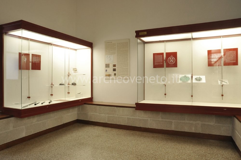 La vetrina successiva espone due eccezionali dischi figurati in lamina di bronzo provenienti da possibili aree santuariali. Il primo, denominato disco di Rosà dal luogo di ritrovamento, riproduce al centro due figure affrontate, probabilmente un uomo e una donna, ed è databile tra la seconda metà del I sec. a.C. e la metà del I sec. d.C. Il disco è stato rinvenuto in associazione con una grande armilla in bronzo a capi annodati di tradizione celtica. Il disco di Marostica invece, databile tra il III e il I sec. a.C., ritrae tre registri di figure: in quello superiore sono rappresentati quattro soggetti maschili di profilo dotati di armi, scudo ed elmo; in quello centrale quattro soggetti maschili resi frontalmente e provvisti di corazza; in quello inferiore due bovini. Il rinvenimento di un oggetto sacro (un simpulum) nello stesso contesto ne conferma la funzione sacra.