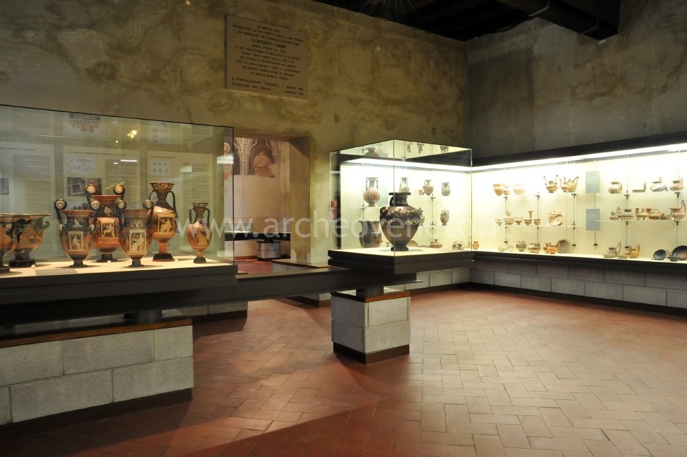 All’interno della prima vetrina, a destra dell’ingresso, s’incontrano alcuni esempi di produzione vascolare d’importazione corinzia di VII-VI sec. a.C., decorati con il caratteristico fregio zoomorfo a figure nere su fondo chiaro di gusto orientalizzante. Ben presto la ceramica corinzia venne superata da quella attica a figure nere, di cui ci rimangono eccezionali esempi di kylikes con fregi miniaturistici, figure di cavalieri e danze dionisiache e un’anfora con scena di Elena restituita da Menelao. Nella successiva parte della vetrina sono presentate le tipologie ceramiche indigene con decorazione geometrica provenienti dalla Peucezia (metà del VII - inizi del V sec. a.C.). A fianco di questi materiali spicca uno straordinario corredo funerario della seconda metà del VI sec. a.C., che conferma l’acquisizione dei modi ellenici da parte della popolazione locale. Tale corredo è composto da un eccezionale elmo corinzio decorato, un askos daunio bicromo e tre lekythoi attiche a figure nere.
