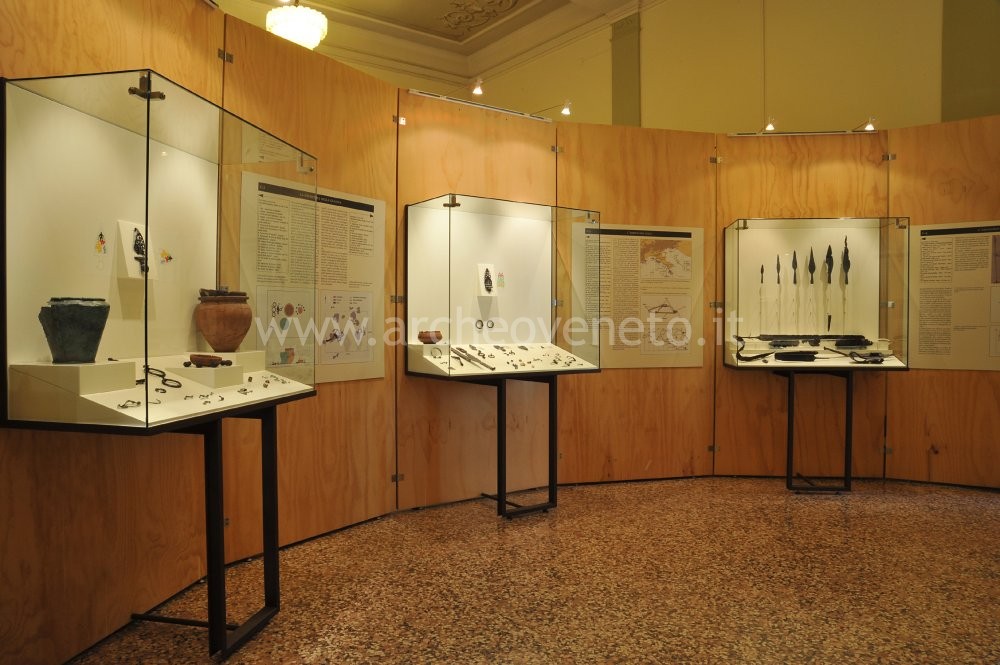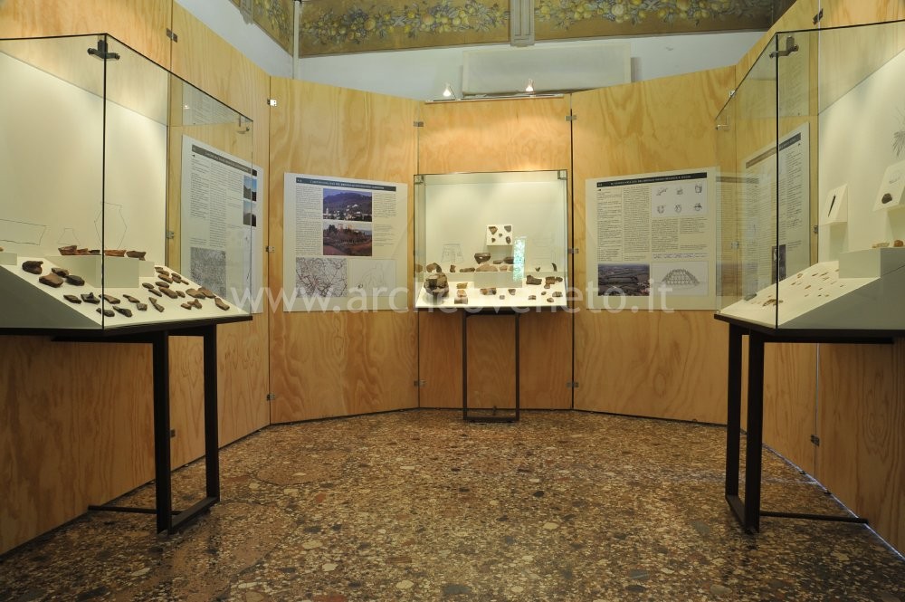 Le ultime due vetrine ospitano il materiale raccolto nello scavo del villaggio e dei depositi rituali di Montecchio. L’area di località Castelli fondo Colombara, occupata già dal VII sec. a.C., ha restituito soprattutto vasi da mensa di vario genere. Nell’adiacente fondo Pegoraro, oltre a vasellame da cucina e da mensa, sono state scoperte due stipi sacre contenenti sia offerte votive sia utensili, come alcuni frammenti di situla e di lamina in bronzo, diversi tipi di fibule, armille, elementi di collana in pasta vitrea, un pendente e un pettine in osso. Anche nei pressi del castello di Romeo è stato rinvenuto materiale inerente alla sfera del culto, come testimoniano l’arco di fibula riutilizzato come pendaglio e la laminetta con guerriero in bronzo. Notevoli sono anche l’ascia dalla località Carbonara di fine VI-IV sec. a.C. e la fibula tipo Certosa da Lovara.
